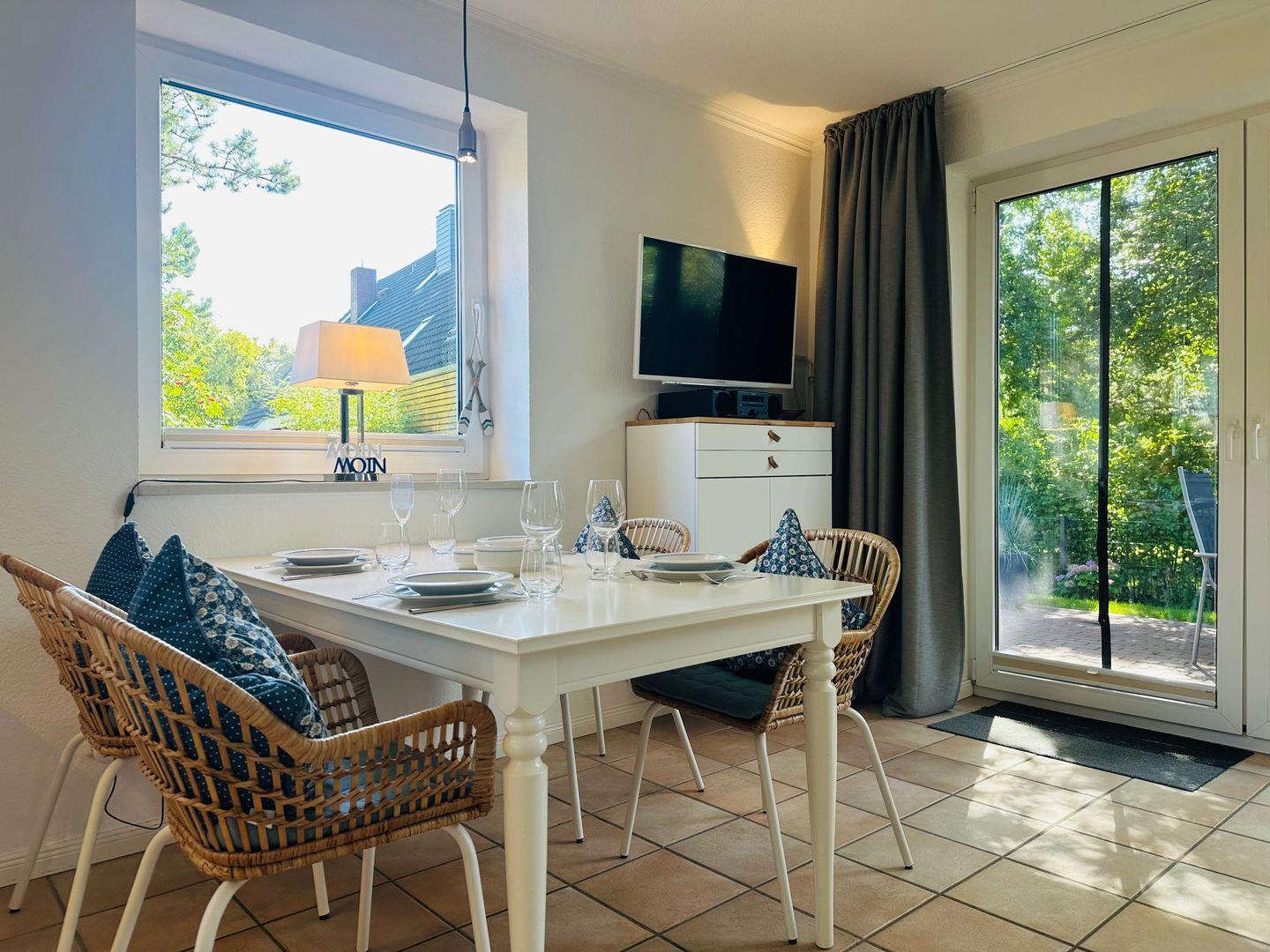 Die maritim moderne Einrichtung des Wohnbereichs mit Essecke vermittelt unbeschwerte Gemütlichkeit und lädt ein, gemeinsame Momente mit der Familie zu genießen.