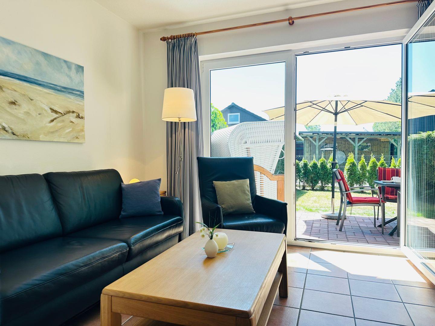 Im Obergeschoss erwarten Sie zwei Schlafzimmer für erholsame Nächte. Draußen stehen eine Terrasse mit Gartenmöbeln und ein Strandkorb bereit – der ideale Ort, um den Tag ausklingen zu lassen.