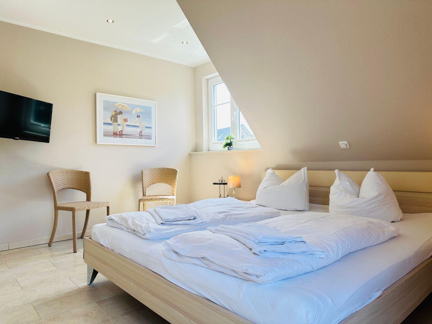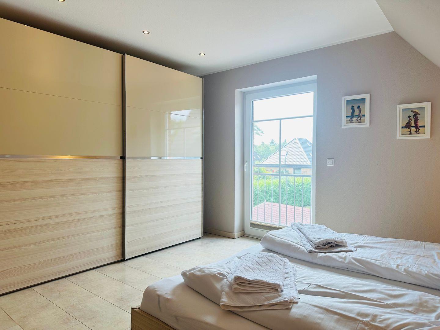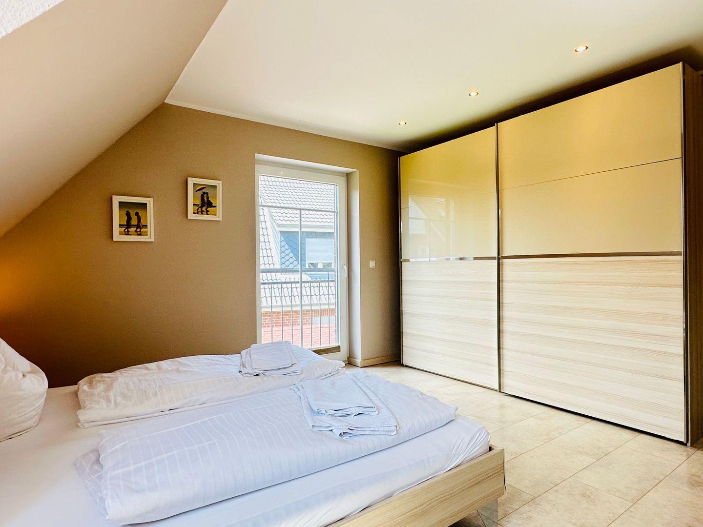 Im Obergeschoss befinden sich zwei komfortable Schlafzimmer, jeweils mit Außenrollläden, großem Kleiderschrank und eigenem Fernseher. Das zweite Bad ist mit Dusche und einer großzügigen Badewanne ausgestattet – ideal zum Entspannen.