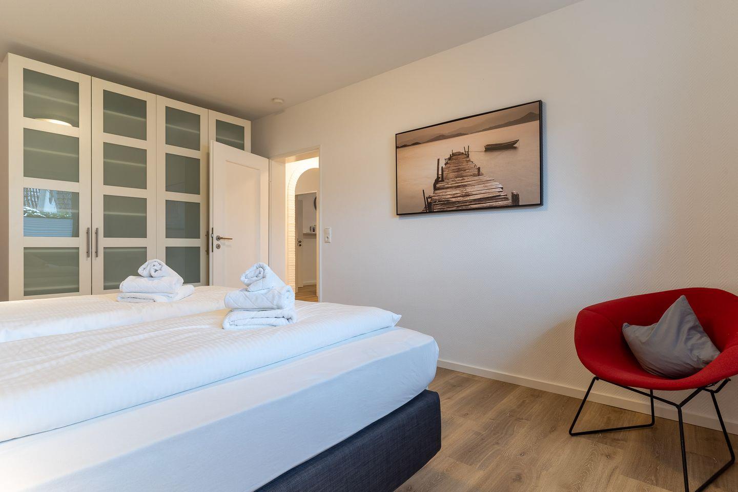 97 qm Erdgeschosswohnung "Seeschwalbe" im Haus Sonnenwinkel für 4 Personen. Großer Wohn- und Essbereich, separate Küche, 2 Duschbäder/WC. 2 Schlafzimmer (1 Doppelbett 180x200 cm, 2 Einzelbetten).