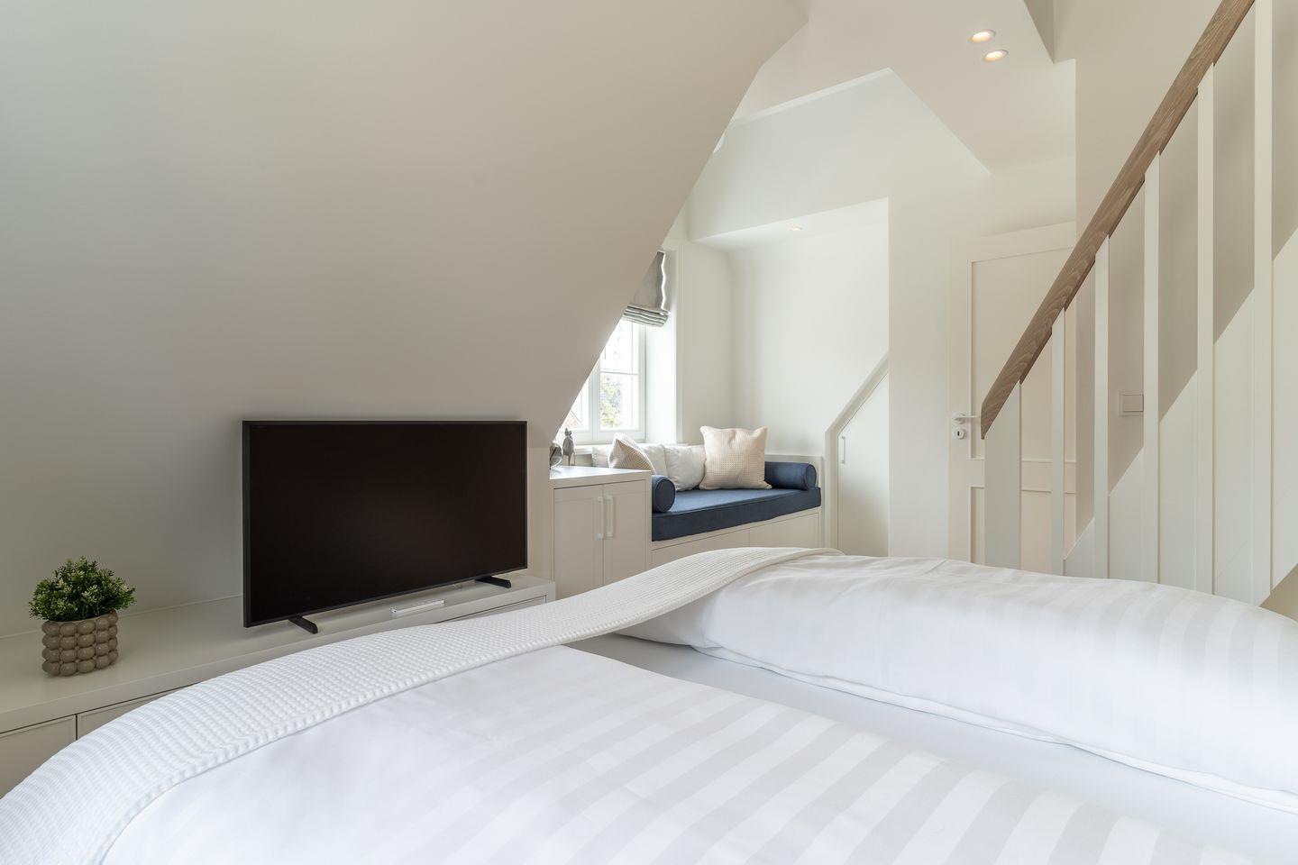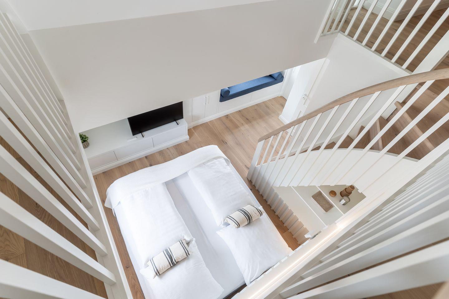 Über eine Holztreppe gelangt man in das Obergeschoss. Die zwei Schlafzimmer, eines mit einem Doppelbett und eines mit einem Einzelbett sind mit einem TV ausgestattet. Kleiderschränke gewähren Ihnen viel Stauraum.