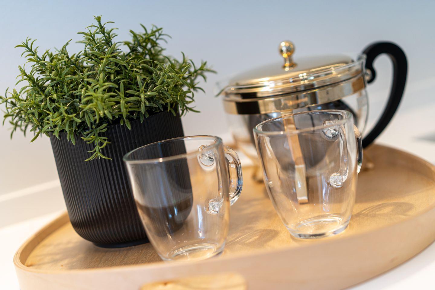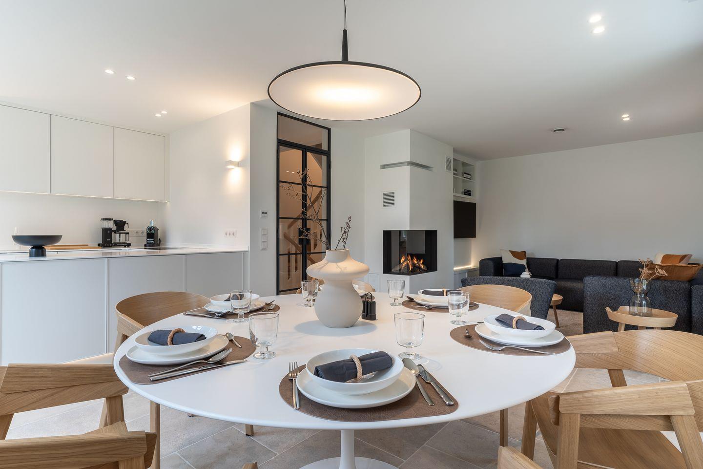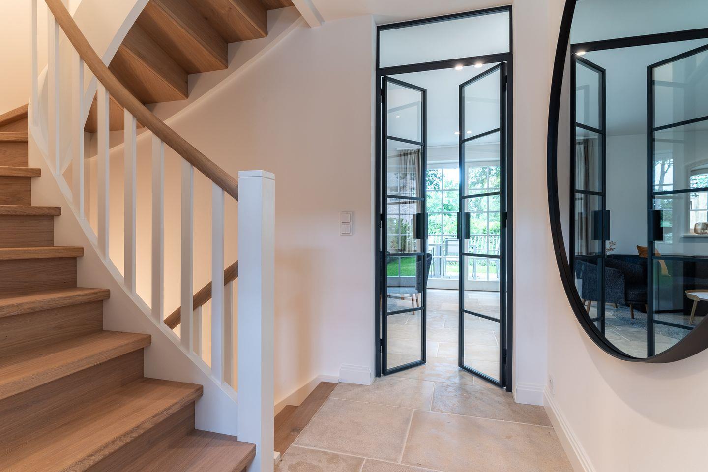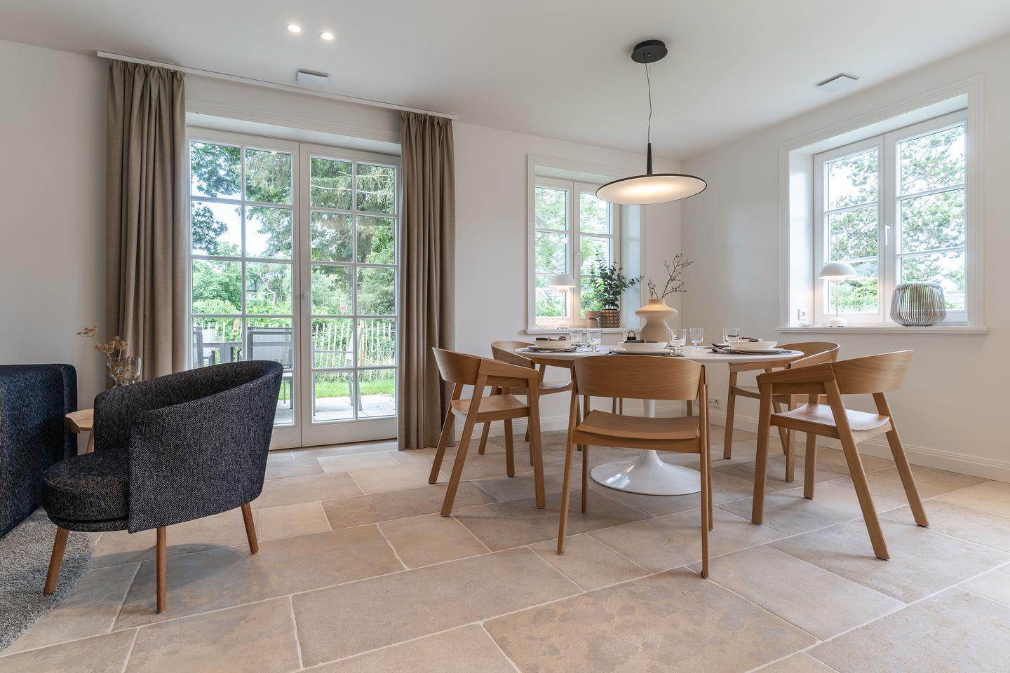 Im Erdgeschoss erwartet Sie ein lichtdurchflutetes Wohnzimmer mit Gaskamin und TV, eine offene Küche sowie ein gemütliches Esszimmer. Die Küche verfügt über hochwertige Elektrogeräte und genügend Platz zum gemeinsamen Kochen. An den Wohnbereich schließt sich ein Flur sowie ein Gäste-WC an.