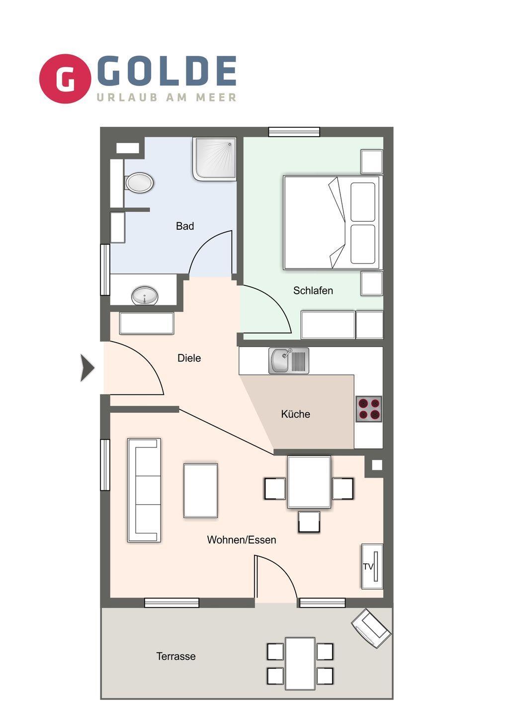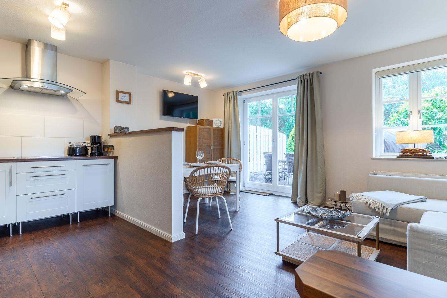 Mit Aussicht auf die eigene Terrasse mit Süd- Westlage, einer Rasenflächen und Ihrem Strandkorb können Sie die Zeit in als auch außerhalb der Wohnung genießen.