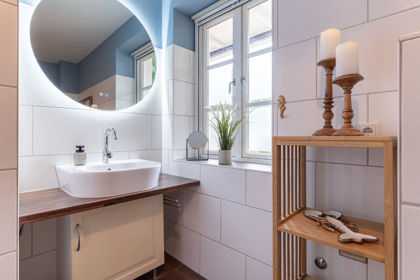Um das Meersalz und den Sand aus den Haaren zu spülen, finden Sie im Bad eine ebenerdige Dusche vor. Für die angenehme Atmosphäre sorgt die Fußbodenheizung, sowie das erwärmte Handtuch.