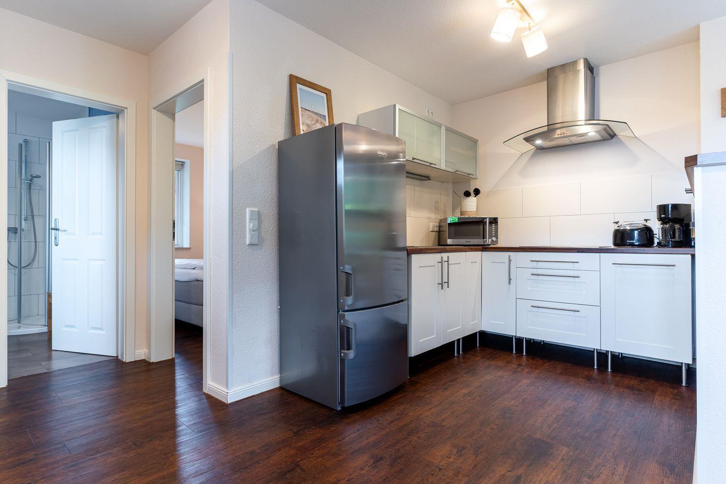 Durch den separaten Eingang betreten Sie den hellen und einladenden Wohnraum mit offener gut ausgestatteter Küche, Essecke und dem Wohnzimmer.