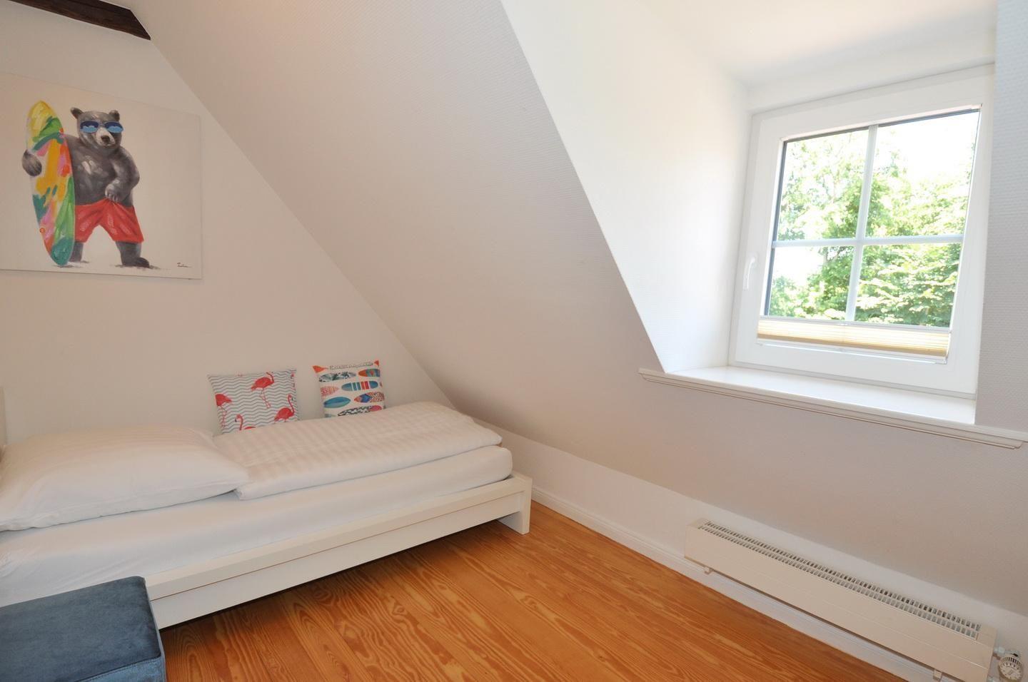 Obergeschoss: ein Schlafzimmer mit Doppelbett (180 x 200 cm - durchgehender Topper), ein Schlafzimmer mit Einzelbett (110 x 190 cm), ein Lesezimmer, ein Duschbad / WC