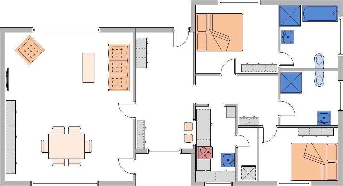 Eingangsbereich mit Zugang zur offenen Küche, Wohnraum mit Essbereich und Zugang zur Terrasse (Westausrichtung), ein Schlafzimmer mit Doppelbett (180 x 200 cm - Einzelmatratzen) und Duschwannenbad en Suite, ein Schlafzimmer mit Doppelbett (160 x 200 cm - Einzelmatratzen), ein separates Duschbad, ein Hauswirtschaftsraum