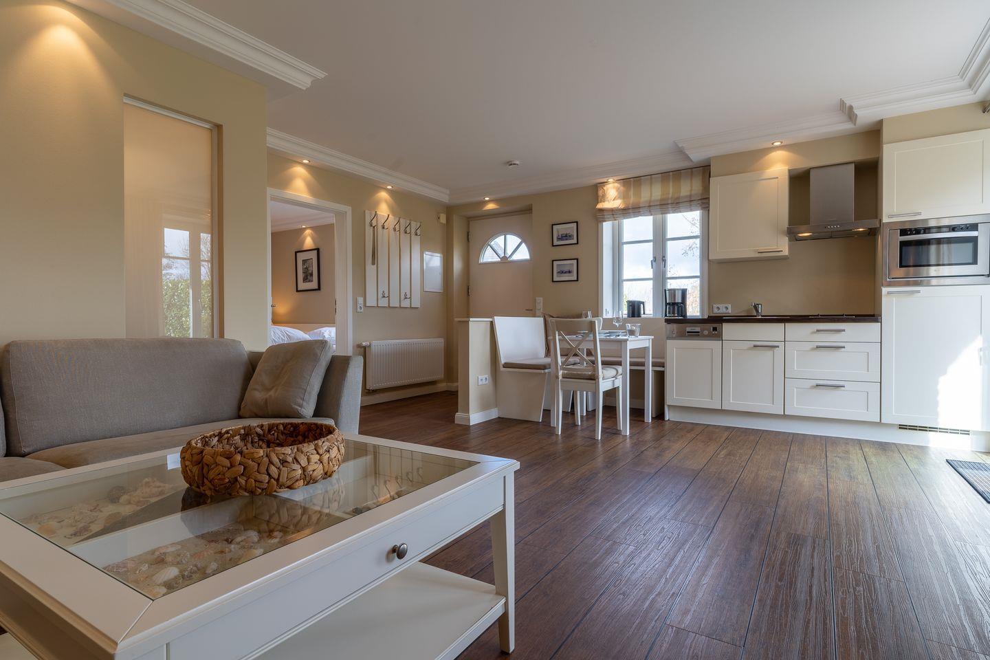 Das wunderschöne Apartment unter Reet wurde mit exklusiven Möbeln ausgestattet und bietet großzügigen Platz für 2 Personen. Das Grundstück mit Stellplatz und einer eigenen Terrassen inklusive Gartenmöbeln und Strandkorb wurde mit hübschen Pflanzen und einem Friesenwall angelegt. Das Apartment befindet sich im Erdgeschoss und verfügt über ca. 45 m² Wohnfläche und teilt sich wie folgt auf: Ein großzügiger Wohnraum mit einer offenen Küche und einem gemütlichen Essbereich. Die Küche ist mit hochwertigen Geräten voll ausgestattet. Ein separates Duschbad bietet jeden Komfort. Im stilvollen Schlafzimmer mit Doppelbett 1,8 x 2,0 m können Sie herrlich entspannen. Mit viel Liebe zum Detail wurde großen Wert auf die Inneneinrichtung gelegt. Das Apartment verfügt über große Fenster und ist somit herrlich lichtdurchflutet.
