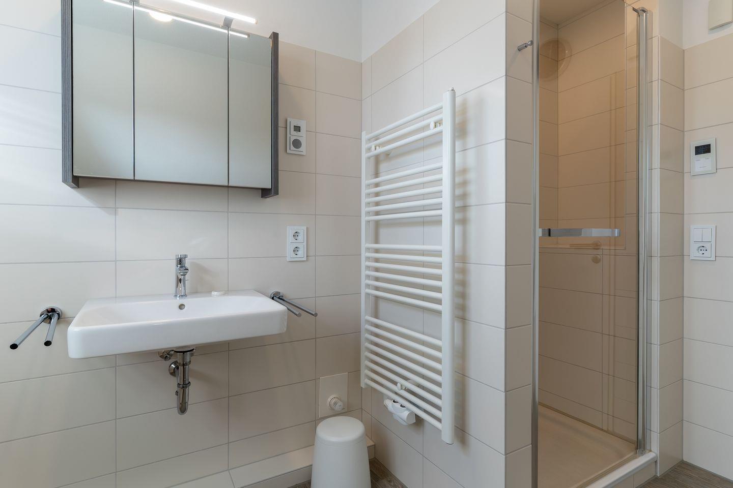 Im Obergeschoss finden Sie ein Schlafzimmer mit einem Doppelbett und TV, sowie ein Schlafzimmer mit zwei Einzelbetten mit Fallschutz und ein Vollbad mit Badewanne/Dusche und WC.