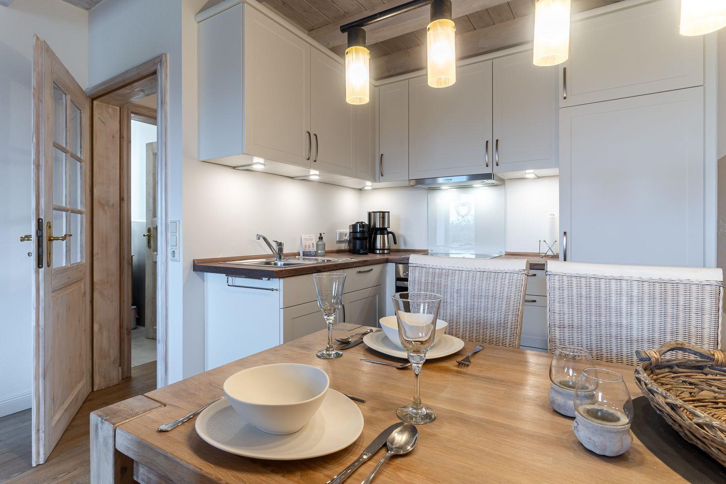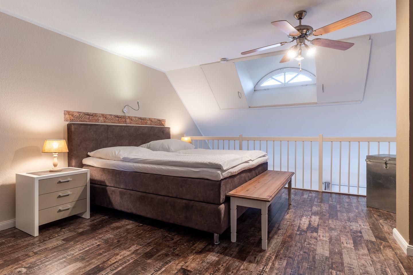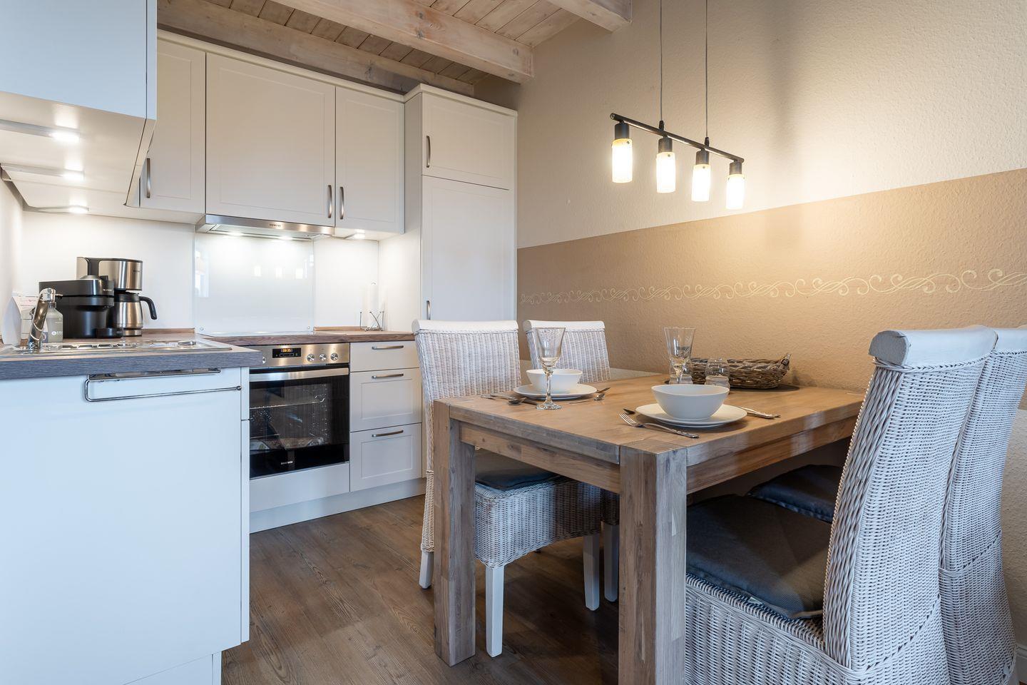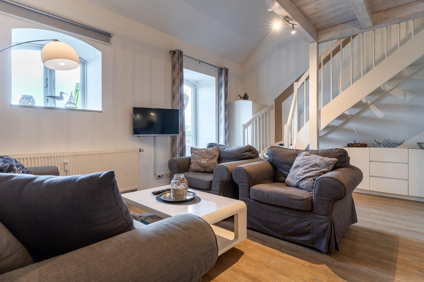 Das Appartement befindet sich im Erdgeschoss und erstreckt sich über 2 Etagen. Es verfügt über ca. 60 m² Wohnfläche und teilt sich wie folgt auf: Auf der ersten Etage befindet sich ein großzügiger Wohnraum mit einer offenen Küche und einem gemütlichen Essbereich. Die Küche ist voll ausgestattet. Ein separates Duschbad bietet jeden Komfort. Über eine Holztreppe gelangt man zur Schlafgalerie im Dachgeschoss. Das stilvolle Schlafzimmer verfügt über ein 1,8 x 2,0 m Boxspringbett mit 25 cm Steg. Weitere 2 Personen können auf der Schlafcouch im Wohnzimmer 1,6 x 2,0 m entspannen. Kostenlose W-LAN Nutzung.