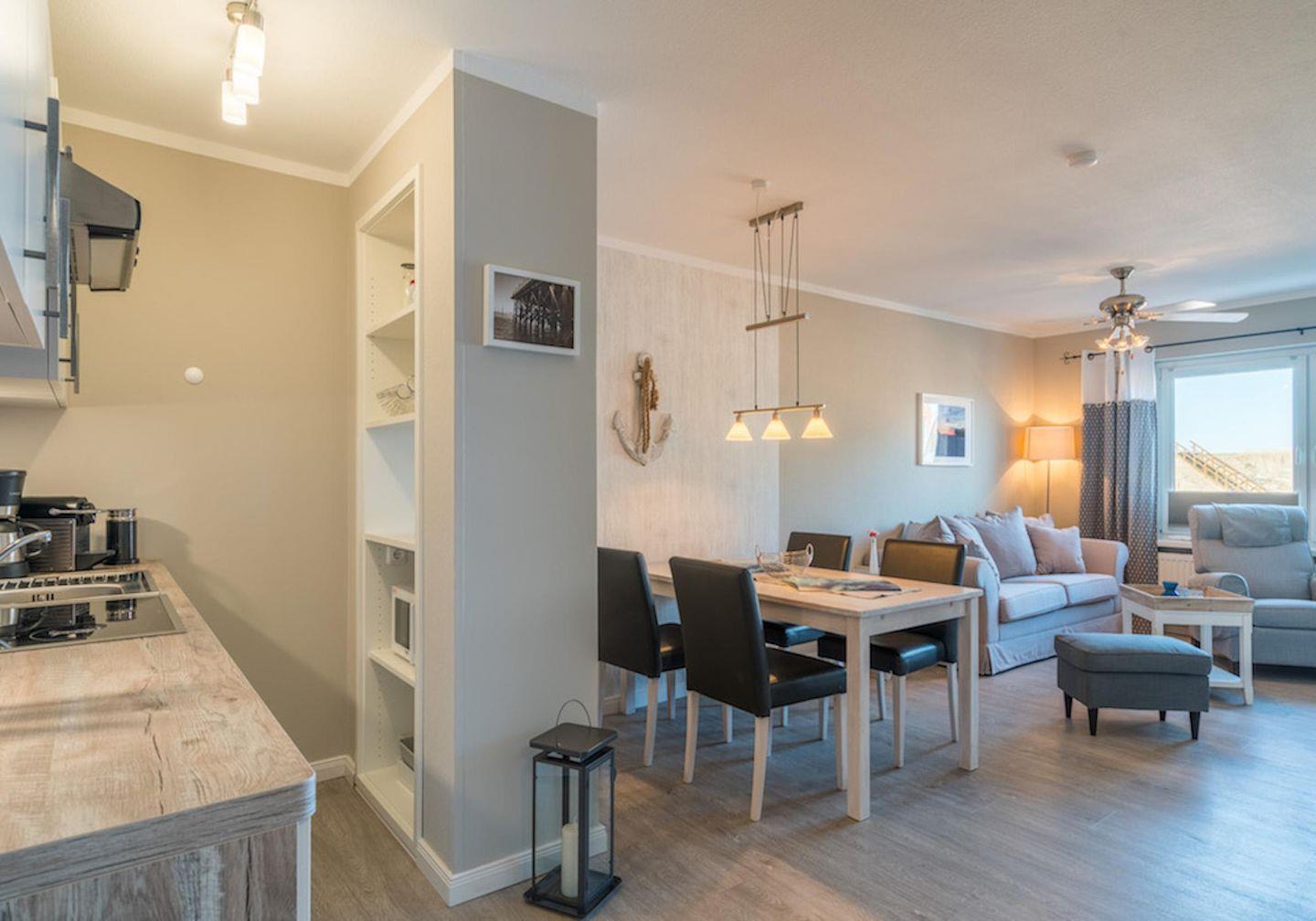 Die 49 qm Ferienwohnung besteht aus einem schönen Wohnbereich mit Couch und Couchtisch. Des weiteren steht ein Esstisch mit 4 Stühlen bereit. Die Küchenzeile der Wohnung ist ausgestattet mit einem Herd mit Ceranfeld und Backofen, Dunstabzugshaube, Geschirr, Kaffeemaschine, Kochtöpfe, Kühlschrank, Mikrowelle, Toastern und einem Wasserkocher.