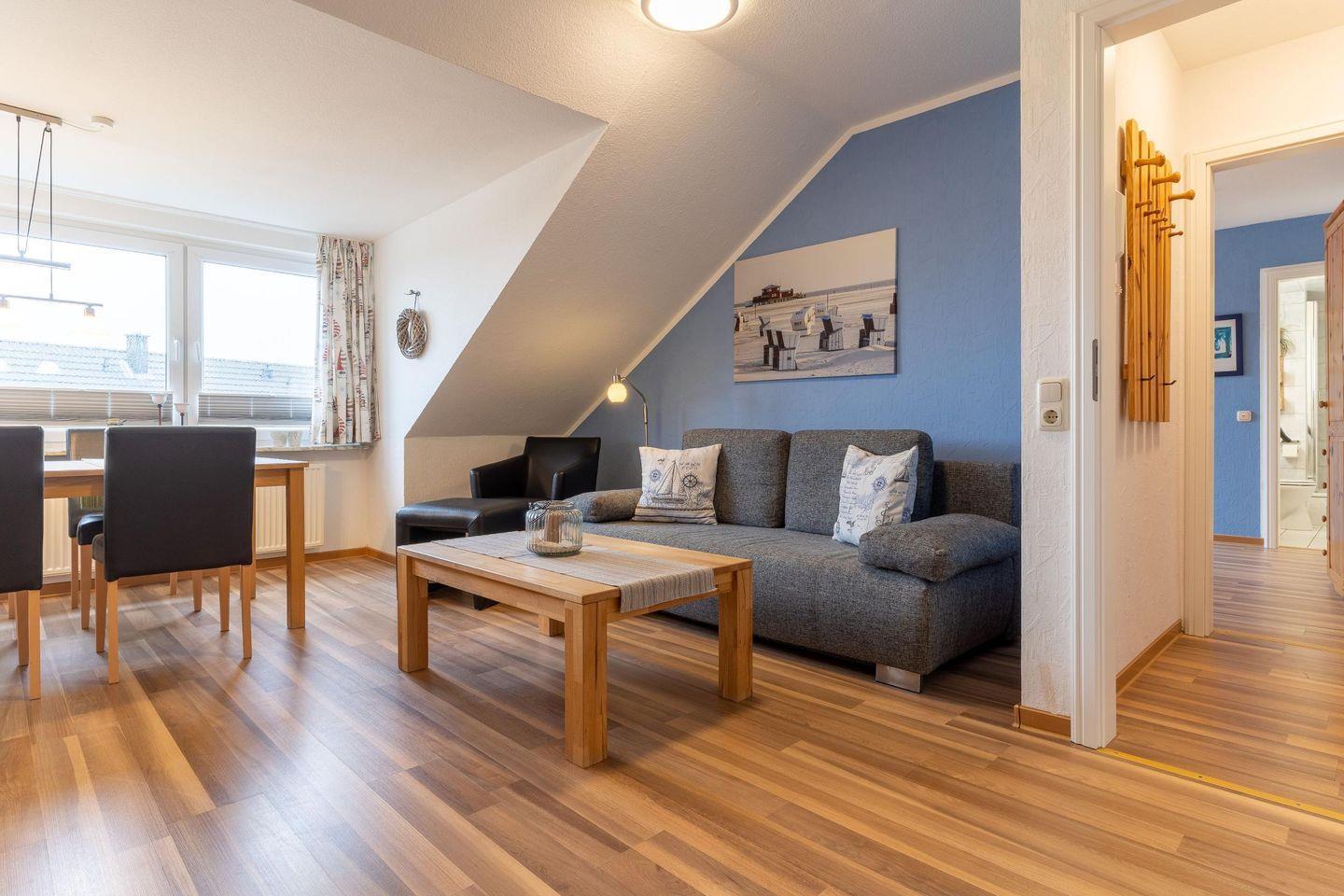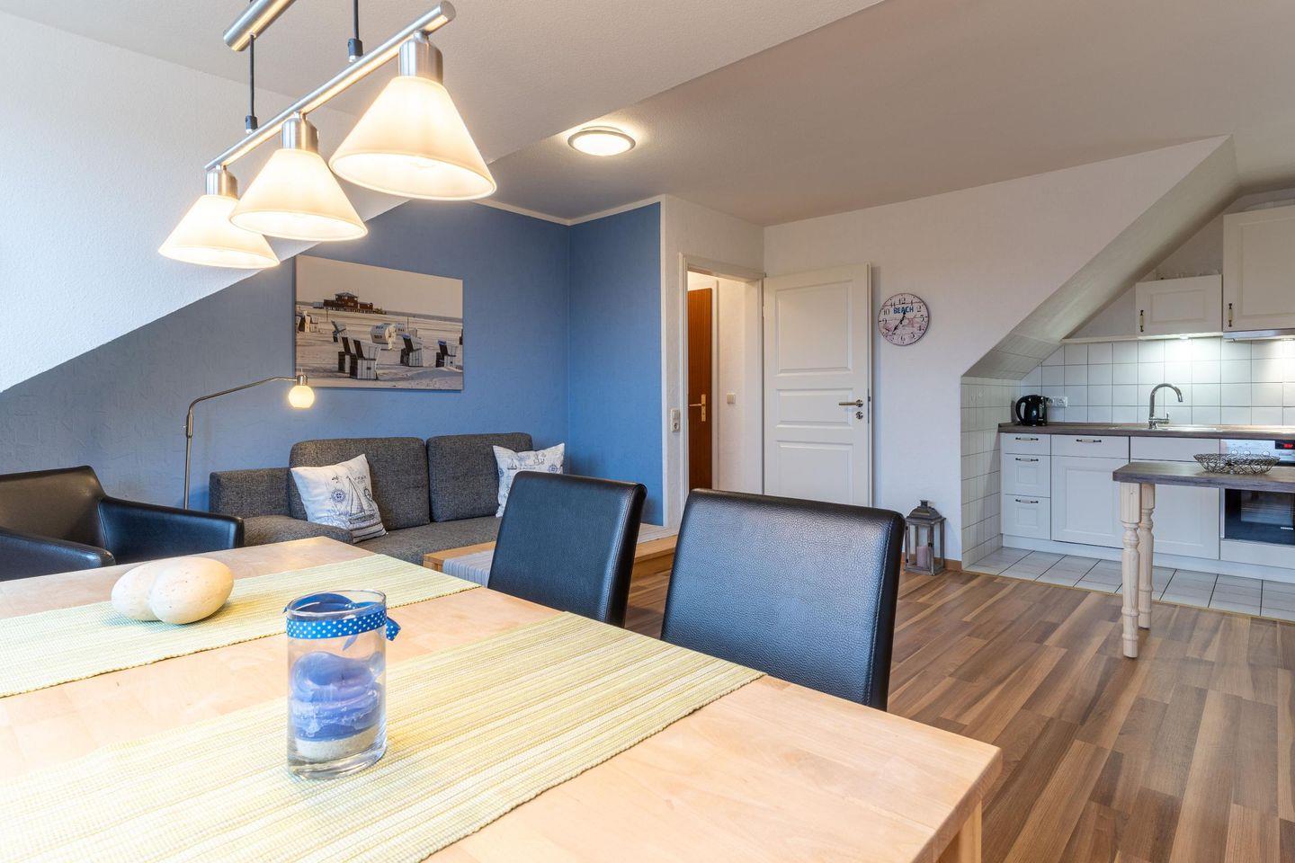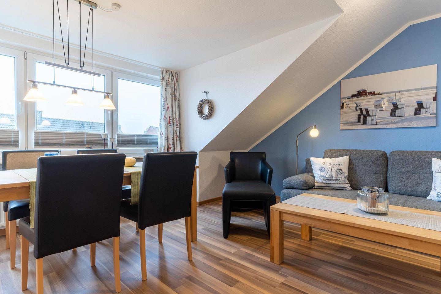 In dieser Wohnung im 2. Obergeschoss frühstücken Sie morgens schon zu viert mit einem spektakulären Blick über den Deich oder genießen den Sonnenuntergang am Abend bei einem Glas Wein. Die frisch modernisierten Wohn- und Schlafräume bieten komfortablen Platz für 2-4 Personen auf 54 qm und sind der ideale Ausgangspunkt für Ihren Urlaub.