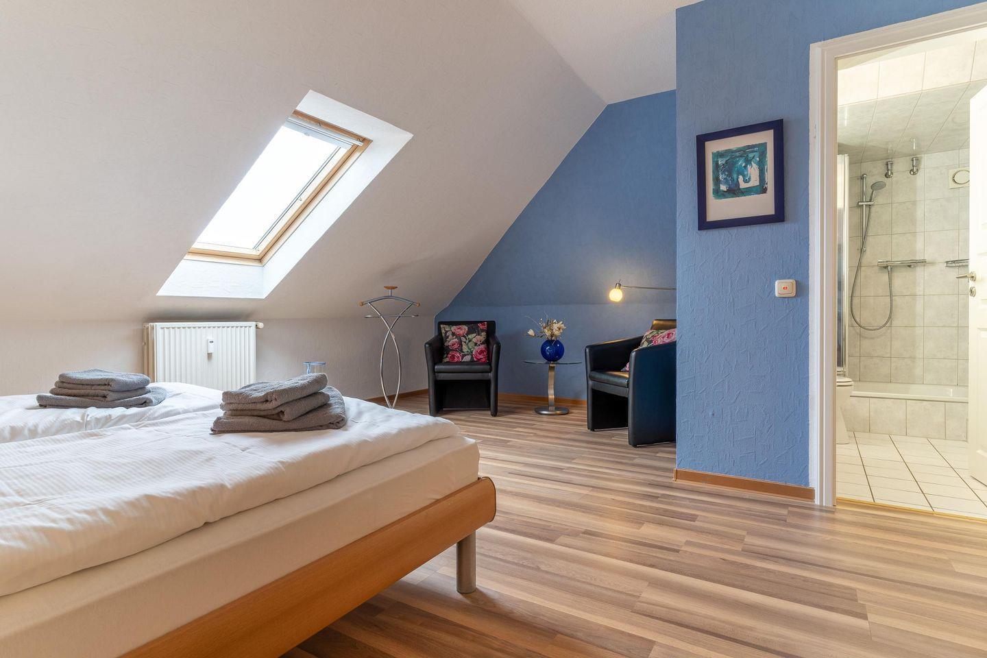 Das Schlafzimmer mit 2 Kommoden, 2 Nachttischen, Spiegel, Beistelltisch und Kleiderschrank verfügt über ein Doppelbett (2,00 x 1,80 m). Als weitere Schlafmöglichkeit dient Ihnen eine Schlafcouch. Das Badezimmer besteht aus einer Dusche, Waschbecken und WC. Zur Unterhaltung dient ein Sat-TV Flachbildschirm, Radio sowie WLAN (inklusive). Im Erdgeschoss befindet sich ein Fahrradabstellraum. Dieser kann von allen Feriengästen genutzt werden.