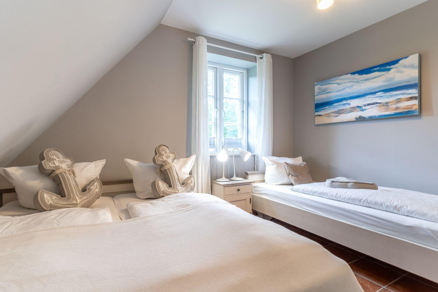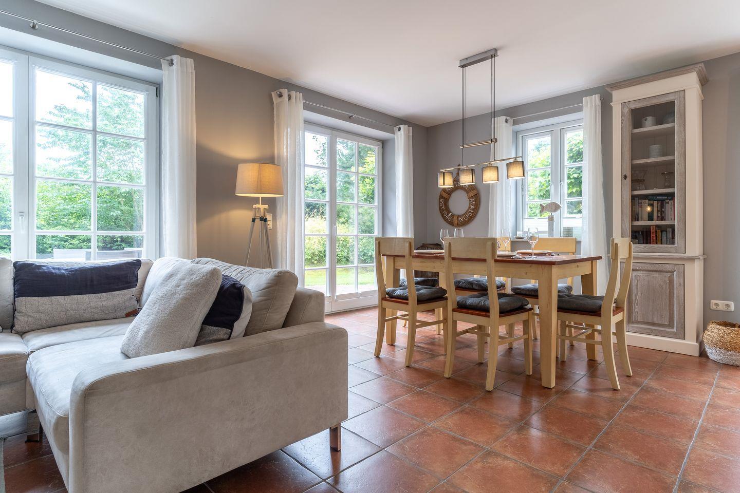 Im Erdgeschoss befindet sich der wunderschöne Wohnraum mit einem gemütlichen Essbereich und Zugang zu 2 Terrassen. Die offene Wohnküche ist mit allen wichtigen Geräten voll ausgestattet und lädt zum gemeinsamen Kochen ein. Ebenso ist im Erdgeschoss ein geräumiger Flur und ein Gäste WC. Im Obergeschoss befinden sich zwei Schlafzimmer. Eines mit einem Doppelbett und großem Kleiderschrank und ein weiteres mit 3 Schlafplätzen, einem Doppelbett und einem Einzelbett. Außerdem ist im Obergeschoss ein geräumiges Vollbad mit Eckbadewanne. Zusätzlicher Luxus im Obergeschoss ist ein weiteres Gäste-WC.