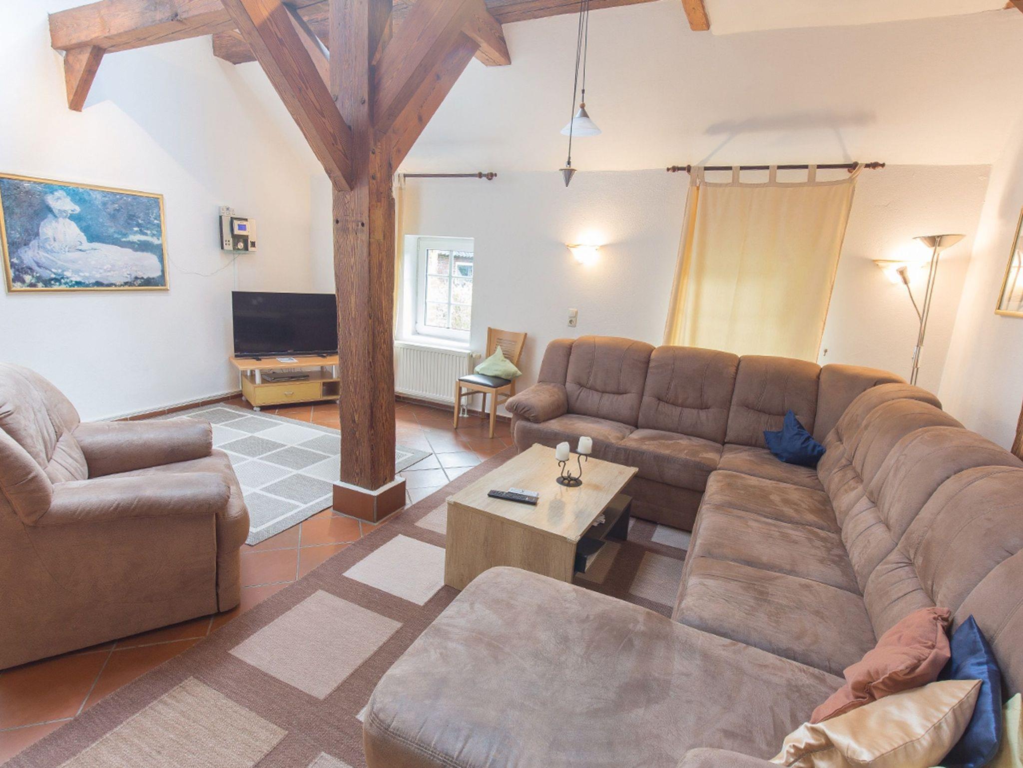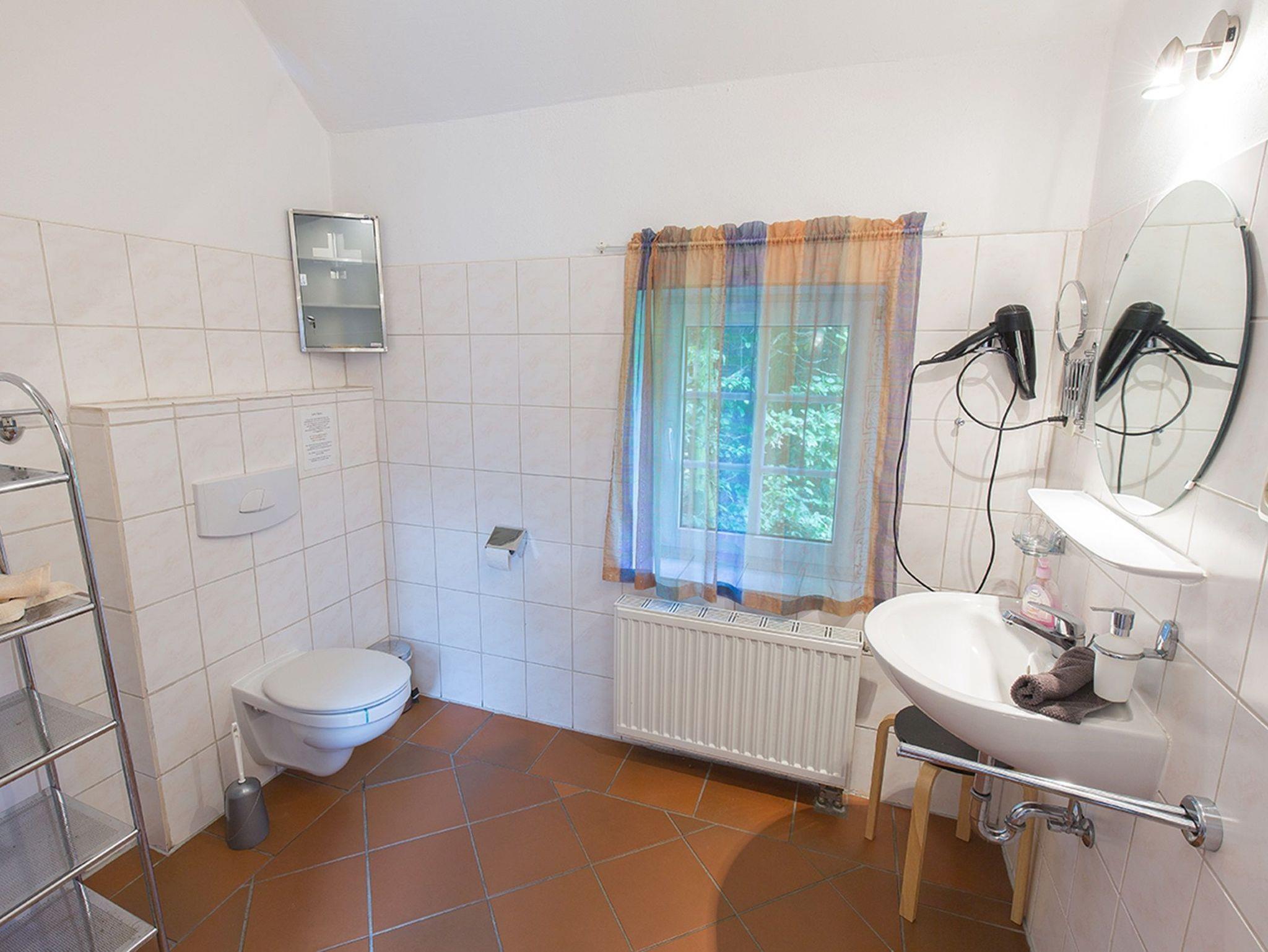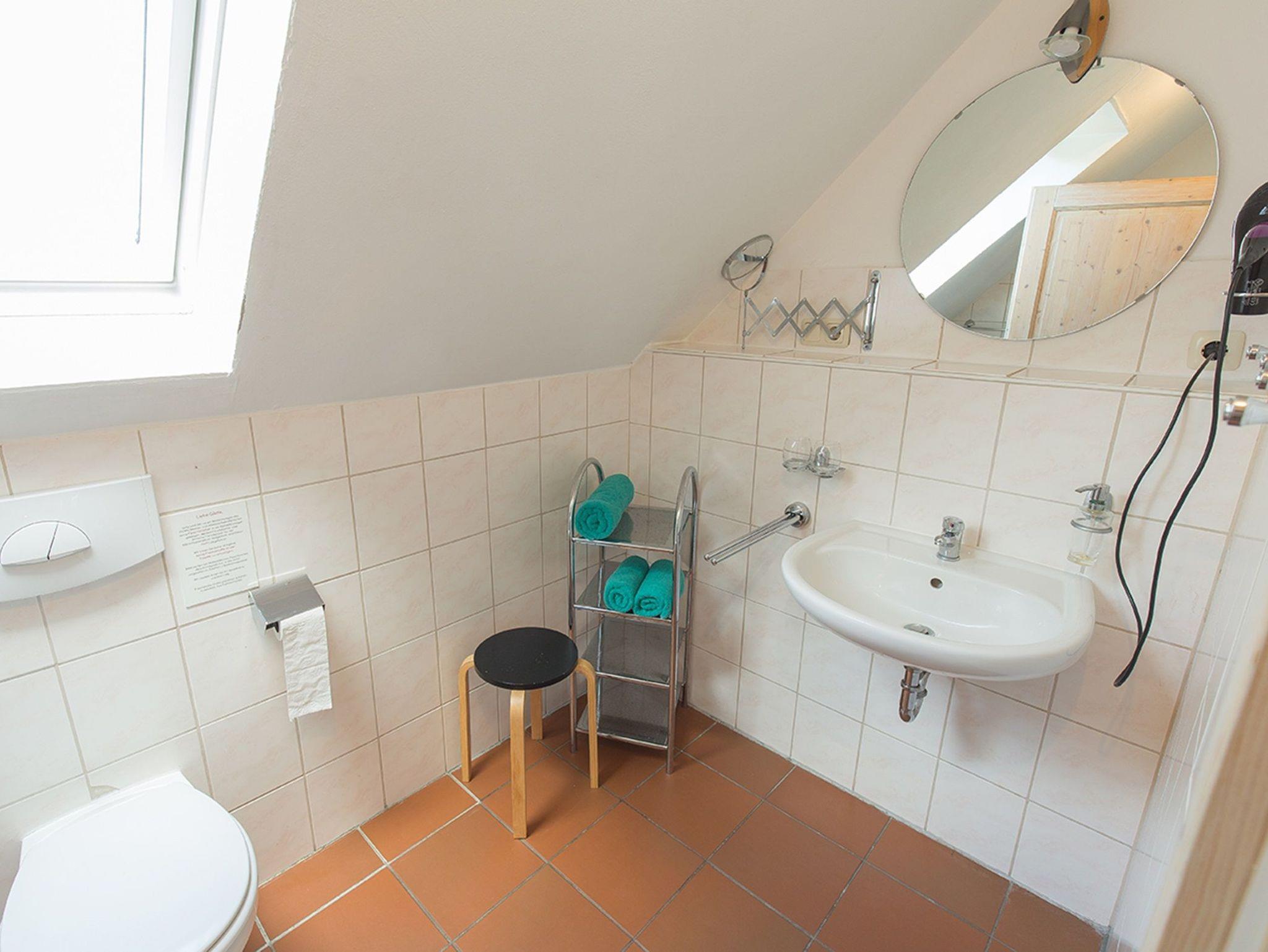 Von der freundlichen Diele mit Garderobe aus gelangen Sie unmittelbar in den Wohnraum mit Kaminofen, großer Sitzlandschaft und Sessel. Direkt dahinter befindet sich die separate voll ausgestattete Küche mit Essbereich in behaglichen Farbtönen. Ein Duschbad mit WC gibt es auf der unteren Ebene. Eine offene Holztreppe führt ins Obergeschoß. Hier befindet sich das weitere Duschbad mit WC sowie die beiden Schlafräume mit je zwei Einzelbetten und viel Platz für Kleidung. Eine weitere offene Holztreffe führt auf die Dach-Schlafempore mit 2 weiteren Einzelbetten - dieser Schlafbereich ist nicht abschließbar. Nutzen Sie ihre eigene große Terrasse mit Blick auf das weitläufige Gelände. Die Wohnung hat einen separaten Zugang und eine eigene möblierte Terrasse. Genügend Parkplätze befinden sich direkt vor dem Gebäude.
