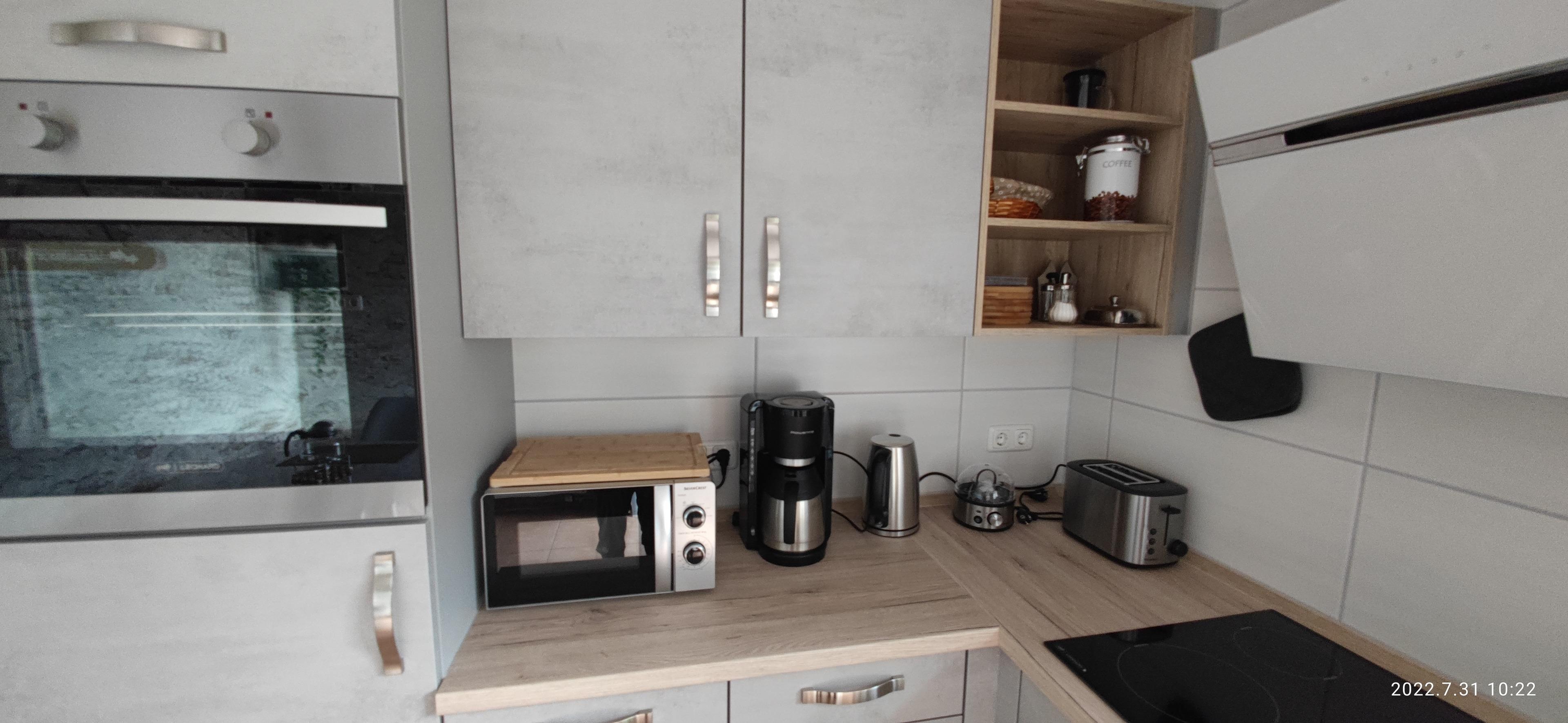 /Mikrowelle/Heißluft-Fritteuse/ Kaffeemaschine/ Geschirrspüler/Tassen/Teller/Töpfe/Pfannen/Besteck etc.