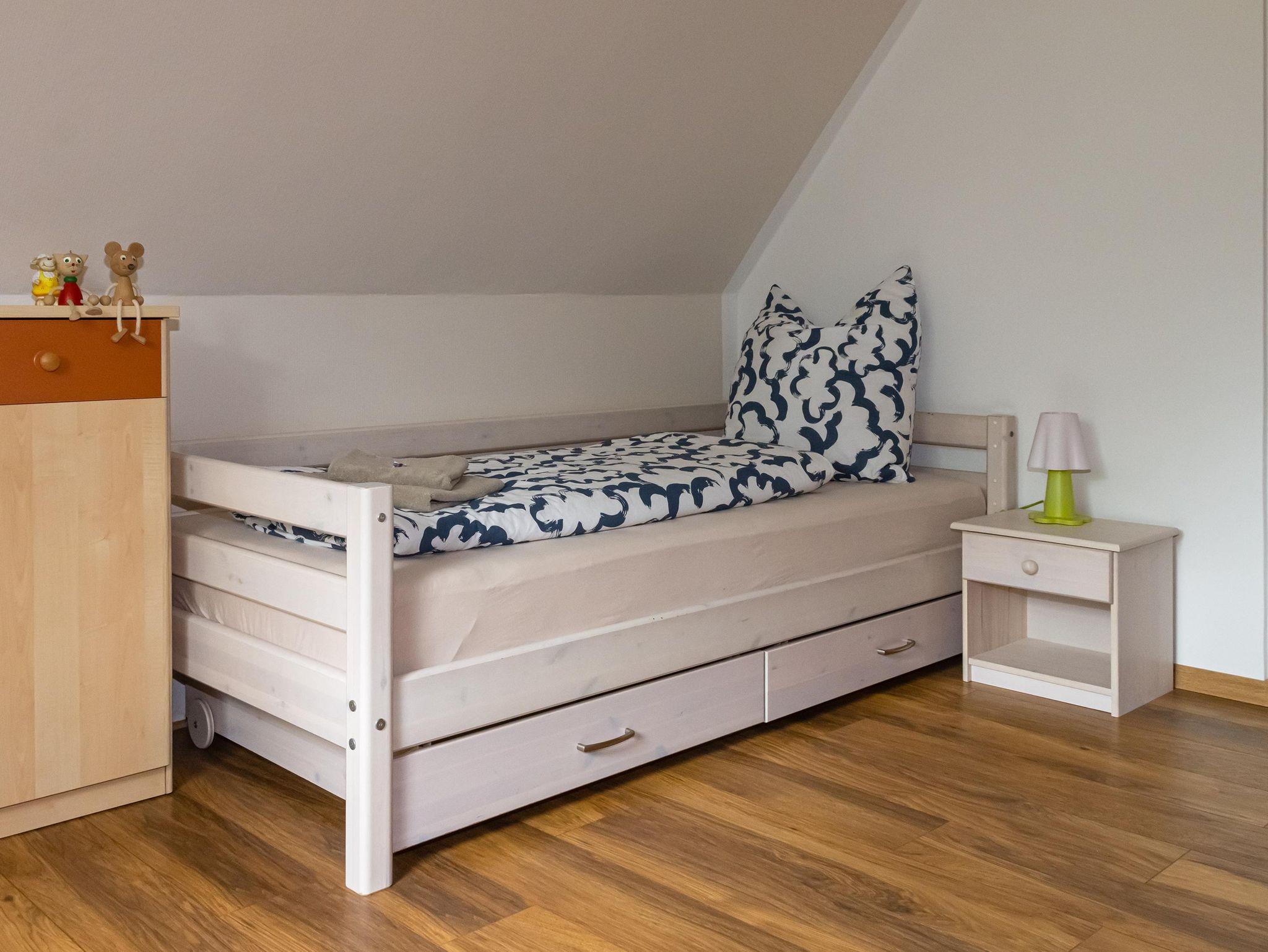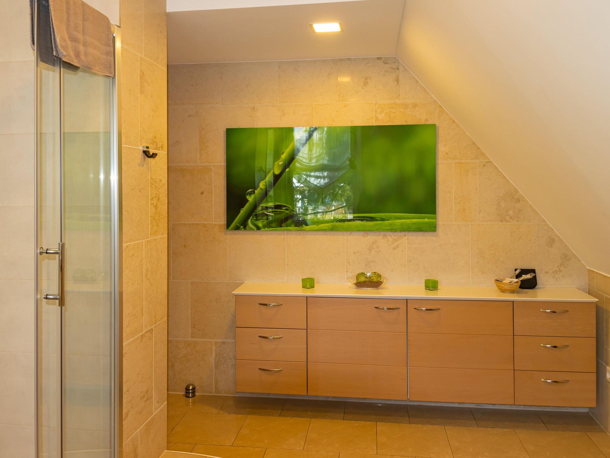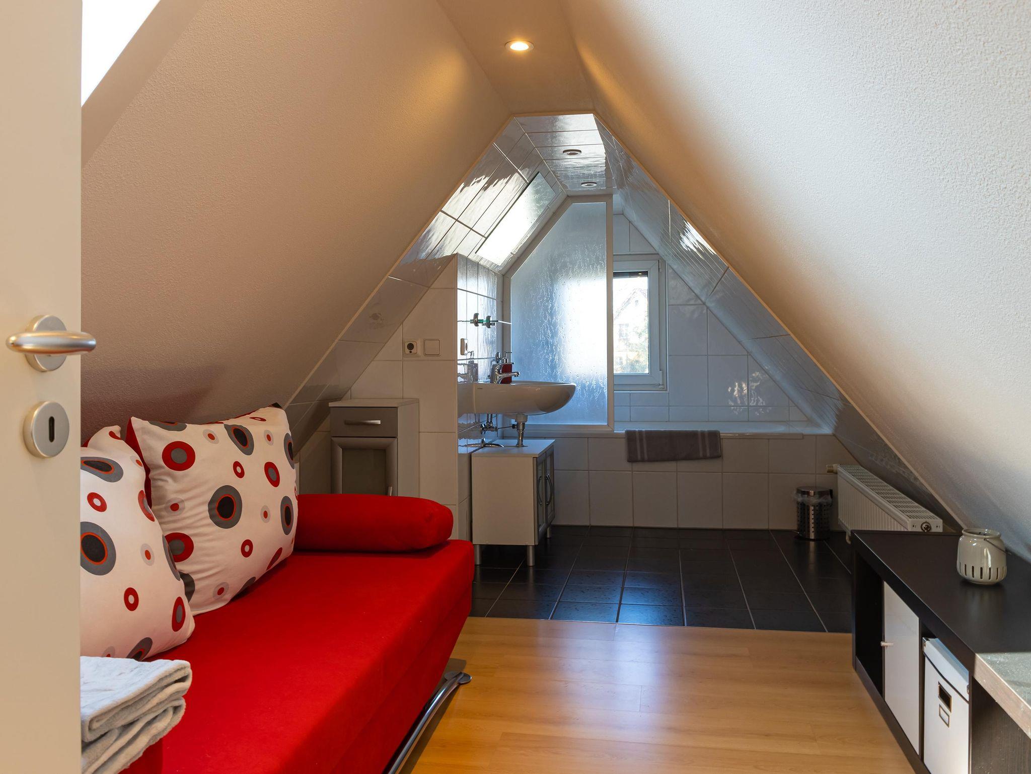 Im Spitzdach gibt es noch ein weiteres Schlafsofa (1,40m) und ein offenes Bad mit Badewanne und Waschtisch. Im Keller befindet sich die Sauna und eine Waschmaschine, die bei Bedarf genutzt werden kann.