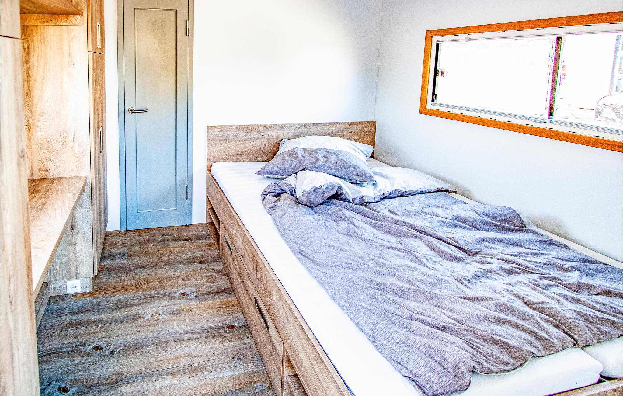 Denne husbåd er moderne og komfortabelt møbleret og kan lejes uden licens. En udvendig stige bagpå fører til tagterrassen, der kan bruges som græsplæne. Det sofistikerede værelse-koncept tilbyder masser af plads selv i de mindste rum - der er et soveværelse med en dobbeltseng og siddepladsen i opholdsområdet kan konverteres til en dobbeltseng. Et solsystem på taget sikrer energiforsyningen.