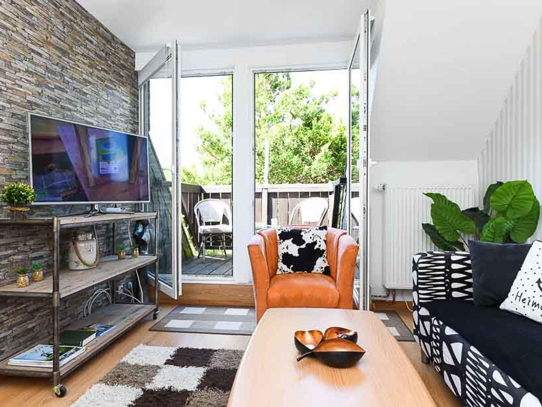 Größe ca. 40 Quadratmeter, Wohnzimmer mit integrierter Küche, Schlafzimmer, Badezimmer mit Dusche, Waschtisch und WC, Obergeschoss, Balkon, optimal für 1 bis 2 Personen und zusätzlich ein Kleinkind.