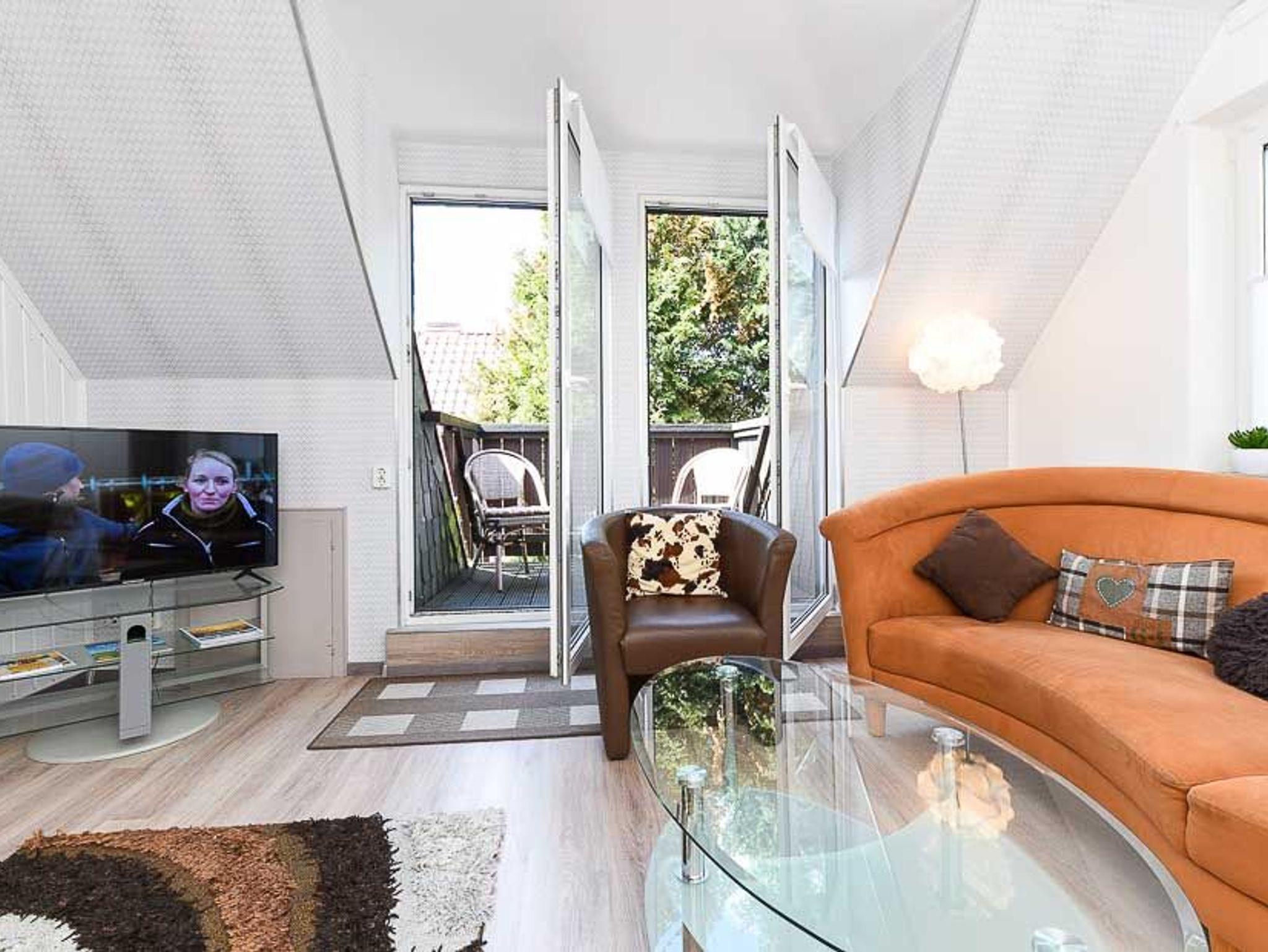 Größe ca. 45 Quadratmeter, Wohnzimmer mit integrierter Küche, Schlafzimmer, Badezimmer mit Dusche, Waschtisch und WC, Obergeschoss, Balkon, optimal für 1 bis 2 Personen und zusätzlich ein Kleinkind.