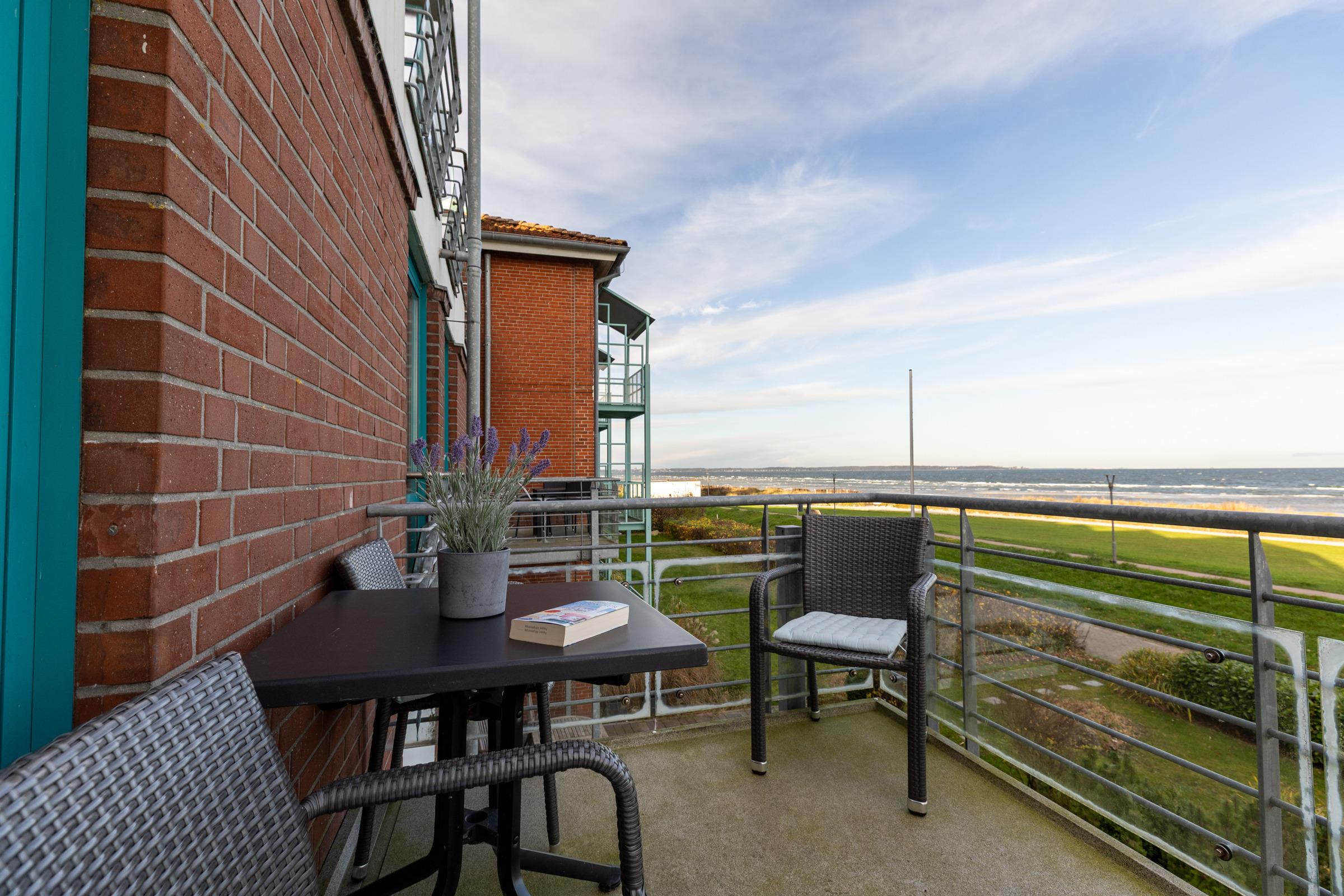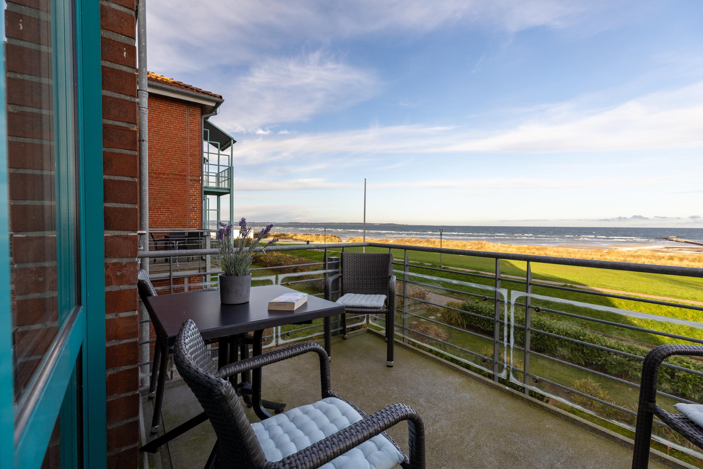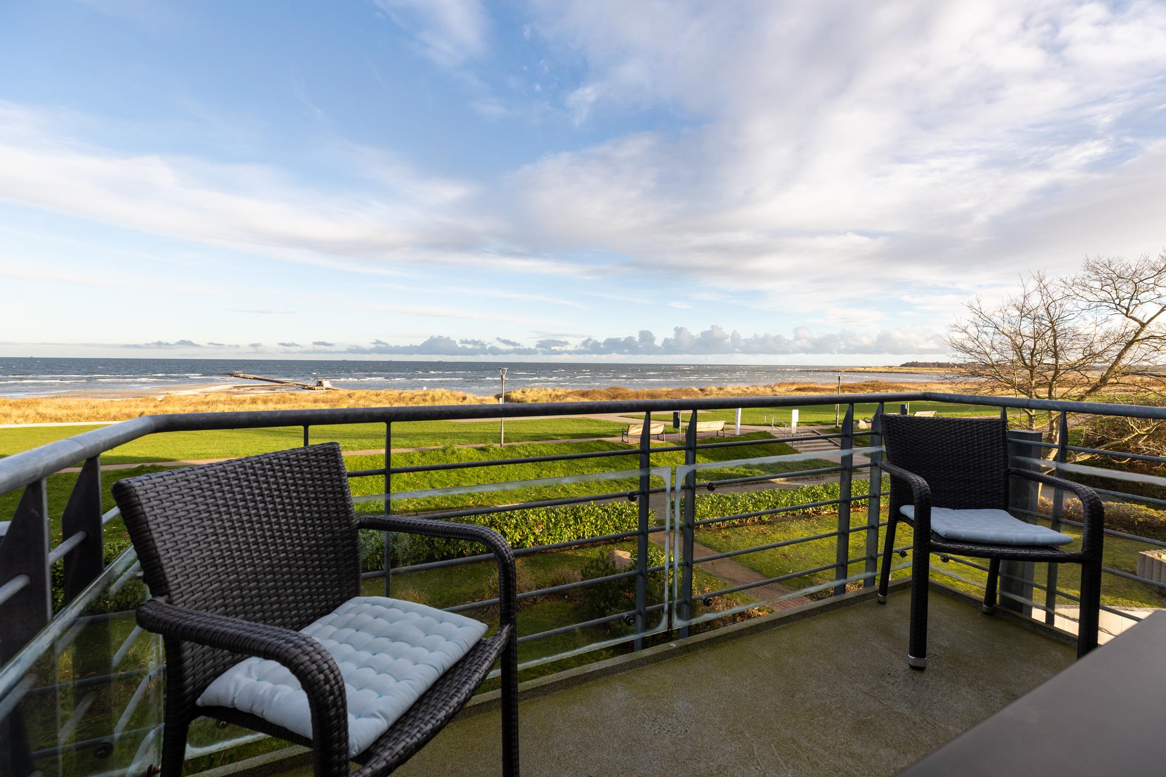 Die Sofaecke lädt in der kühleren Jahreszeit zum Relaxen ein. Erleben und genießen Sie auch von hier die nordische Landschaft, die sich brechenden Wellen, die Möwen am Himmel, vielleicht mit einem guten Buch und einem guten Tropfen. Vom Balkon aus können Sie links in Richtung Kieler Förde und rechts auf die freie Ostsee schauen. Das separate Schlafzimmer ist mit einem Doppelbett ausgestattet. Ihre Garderobe findet Platz im dreiteiligen Kleiderschrank. Ein helles Bad lädt gerade nach Strandspaziergängen zum entspannten Aufwärmen ein.
