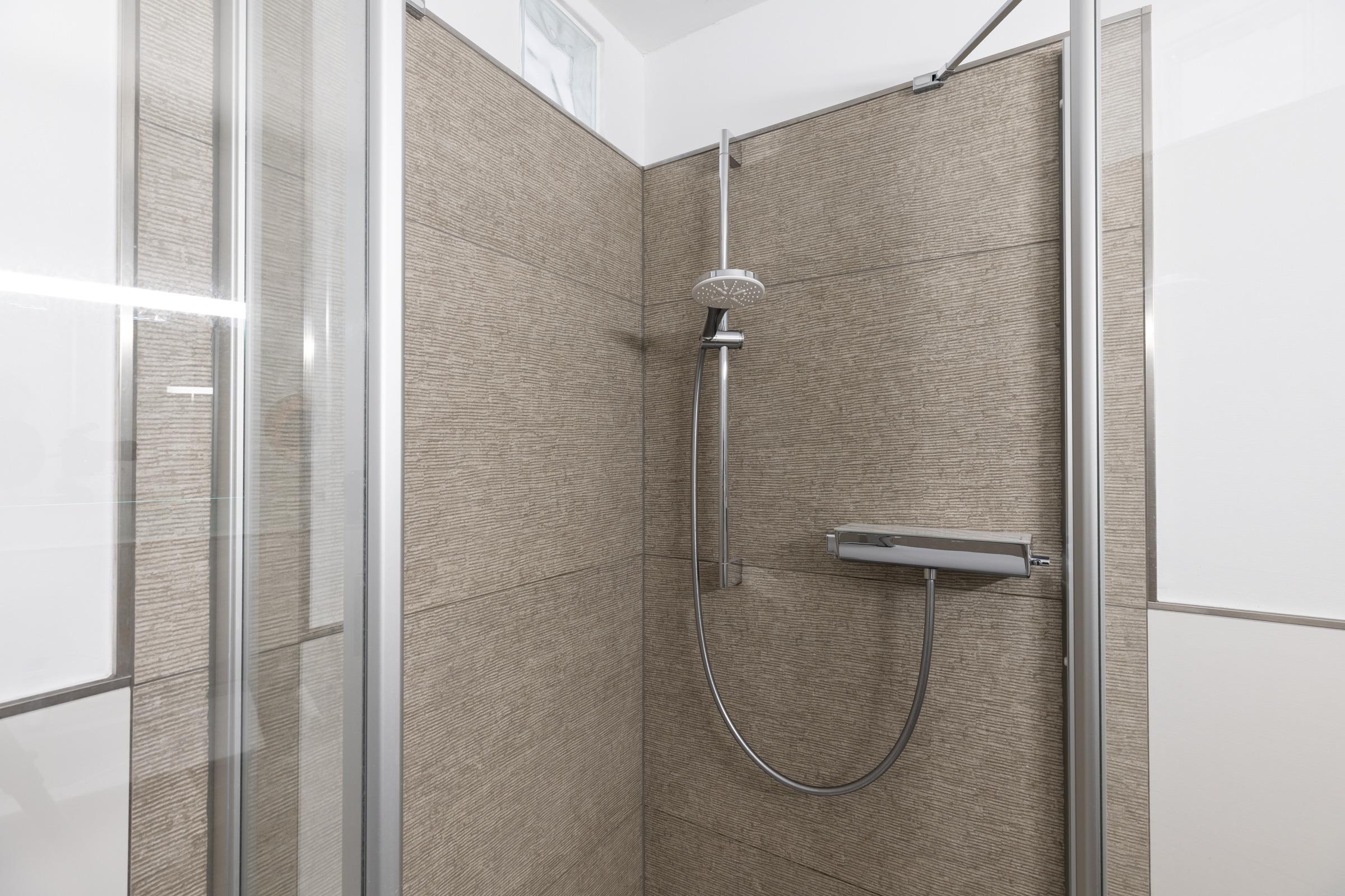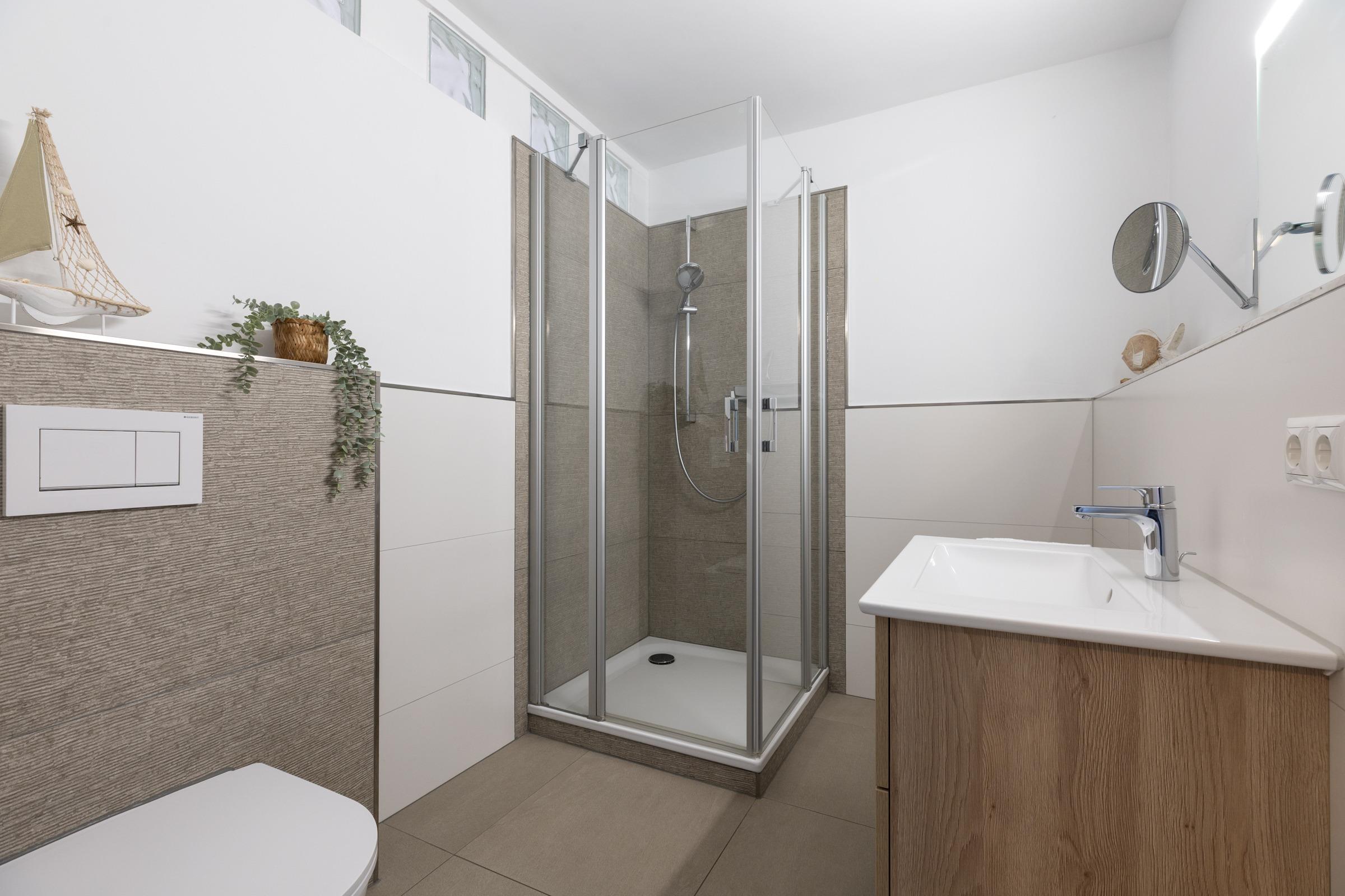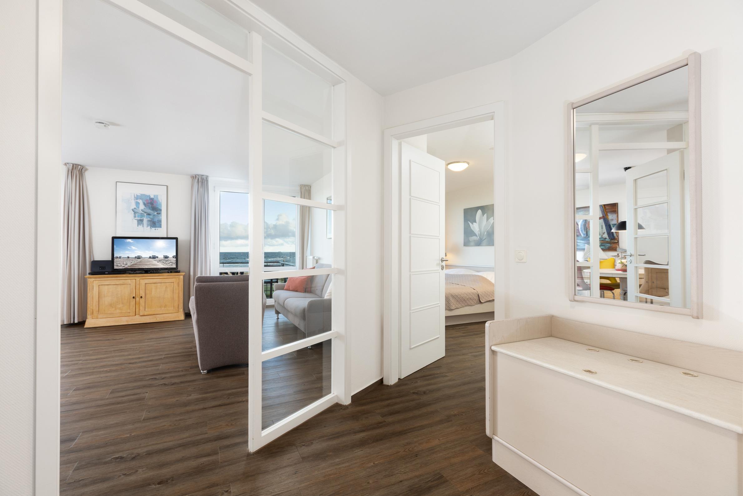 Die Sofaecke lädt in der kühleren Jahreszeit zum Relaxen ein. Erleben und genießen Sie auch von hier die nordische Landschaft, die sich brechenden Wellen, die Möwen am Himmel, vielleicht mit einem guten Buch und einem guten Tropfen. Vom Balkon aus können Sie links in Richtung Kieler Förde und rechts auf die freie Ostsee schauen. Das separate Schlafzimmer ist mit einem Doppelbett ausgestattet. Ihre Garderobe findet Platz im dreiteiligen Kleiderschrank. Ein helles Bad lädt gerade nach Strandspaziergängen zum entspannten Aufwärmen ein.
