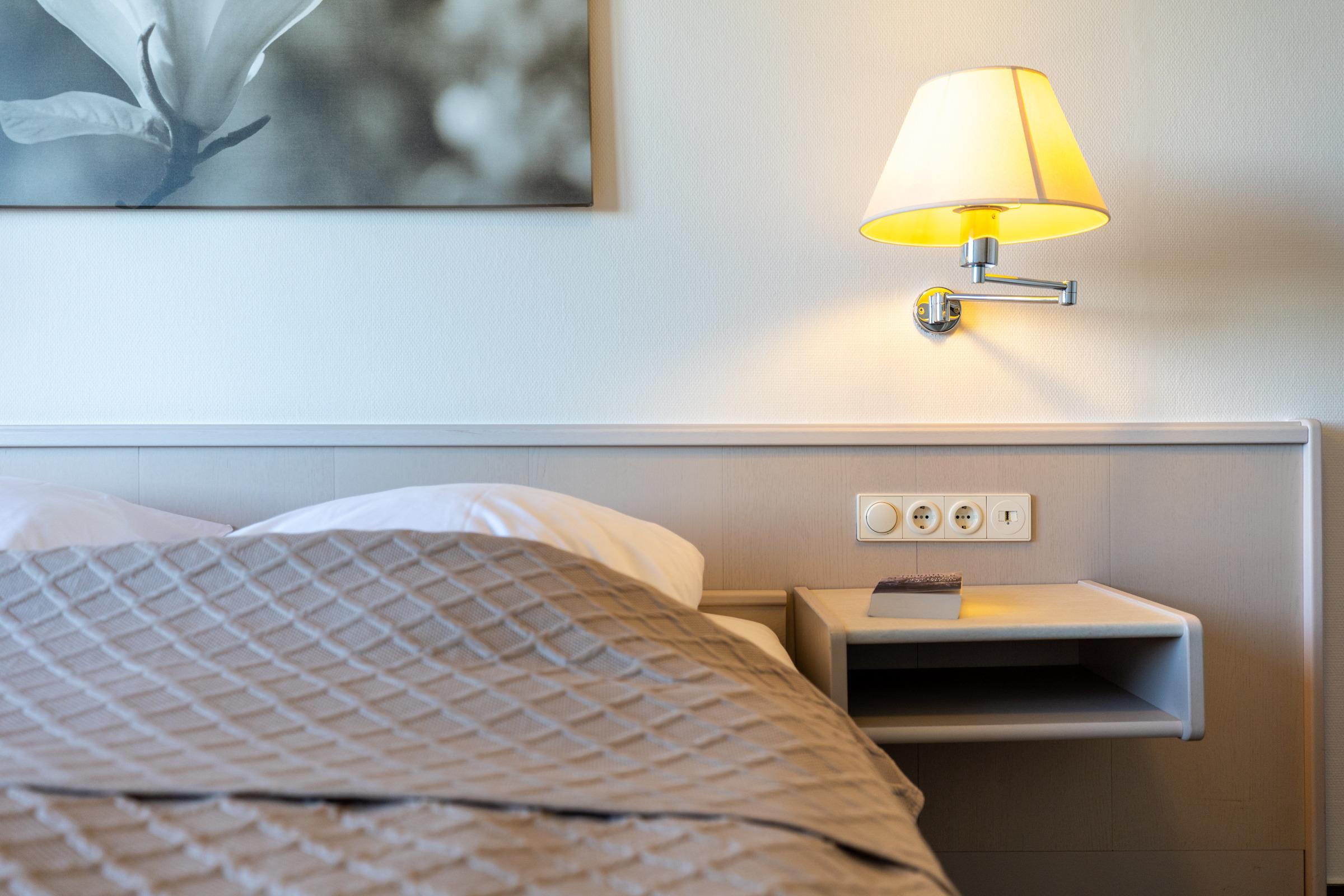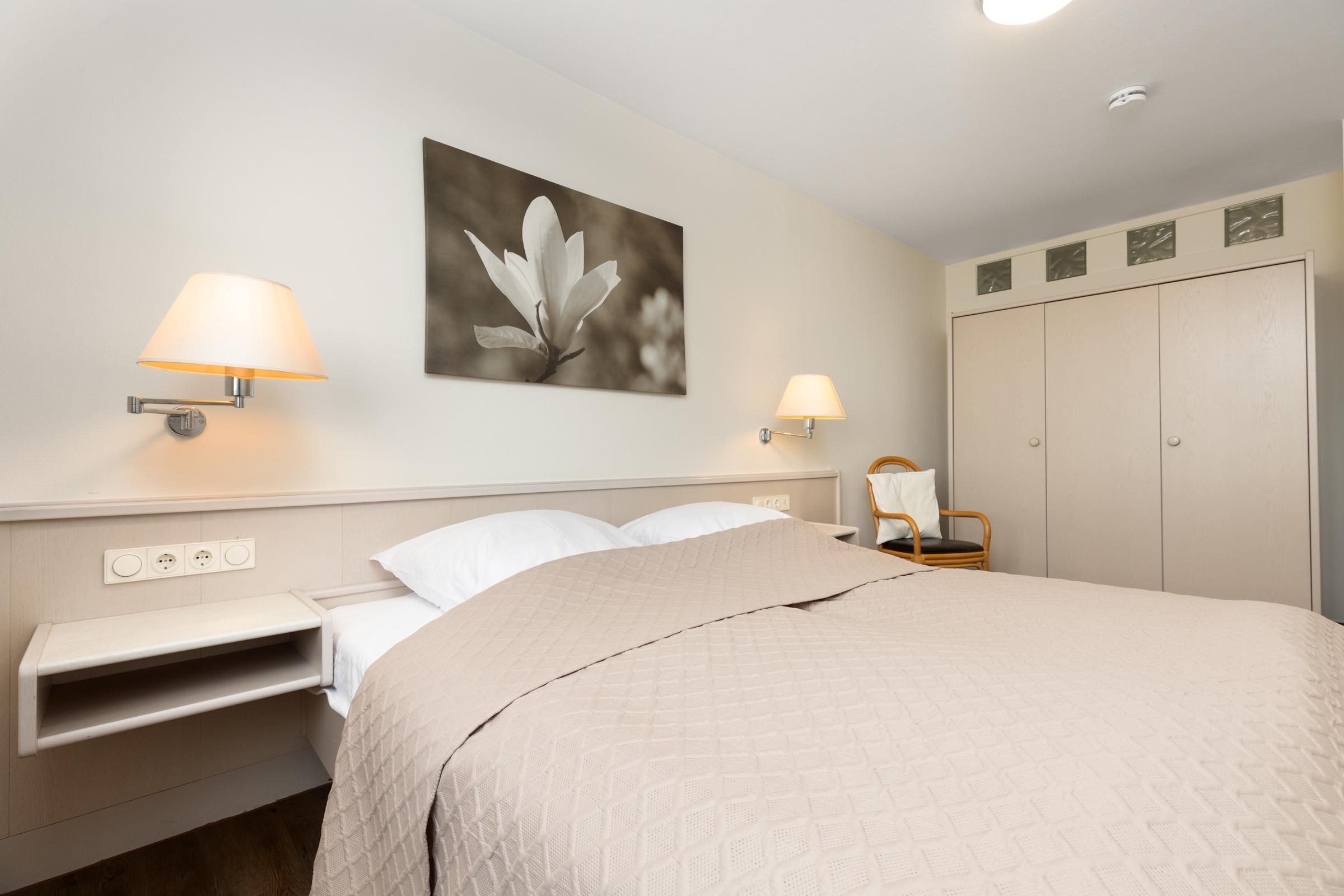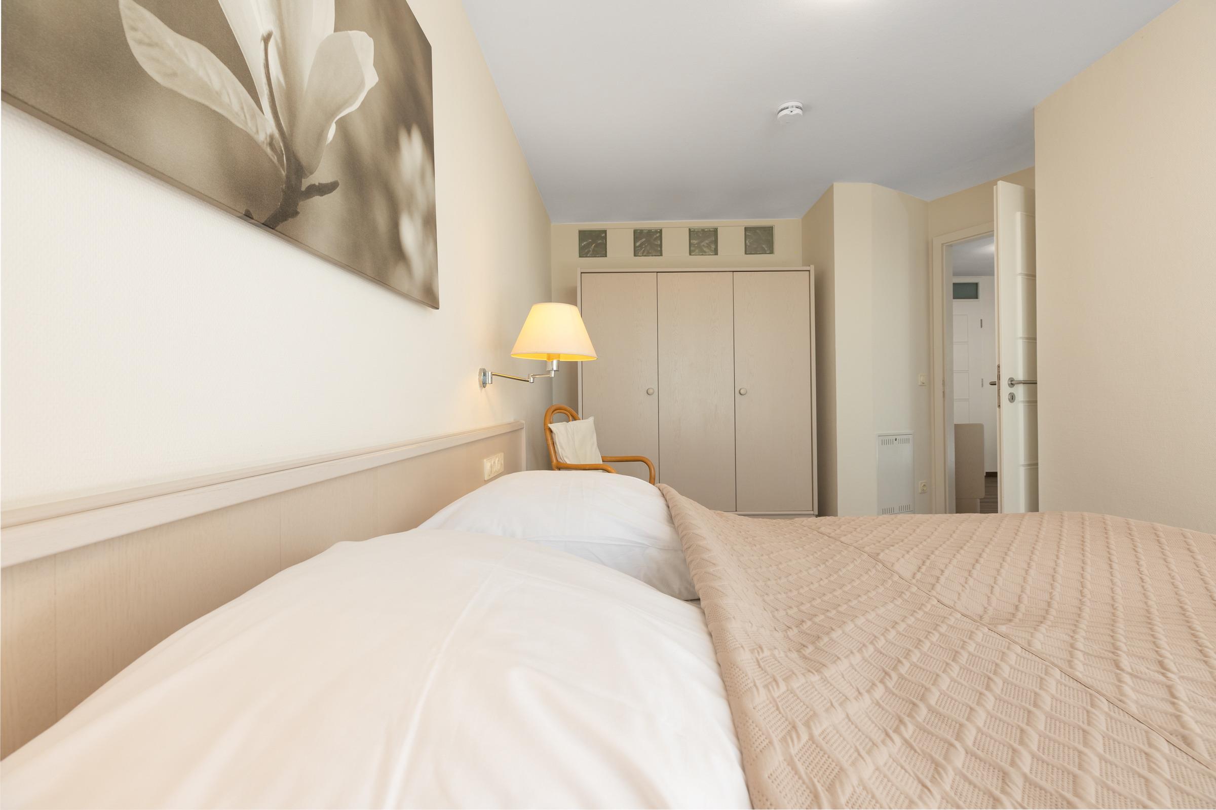 Schlafzimmer: Doppelbett (2x 90x200 cm), Kleiderschrank, Verdunkelung (Vorhänge, Plissee)