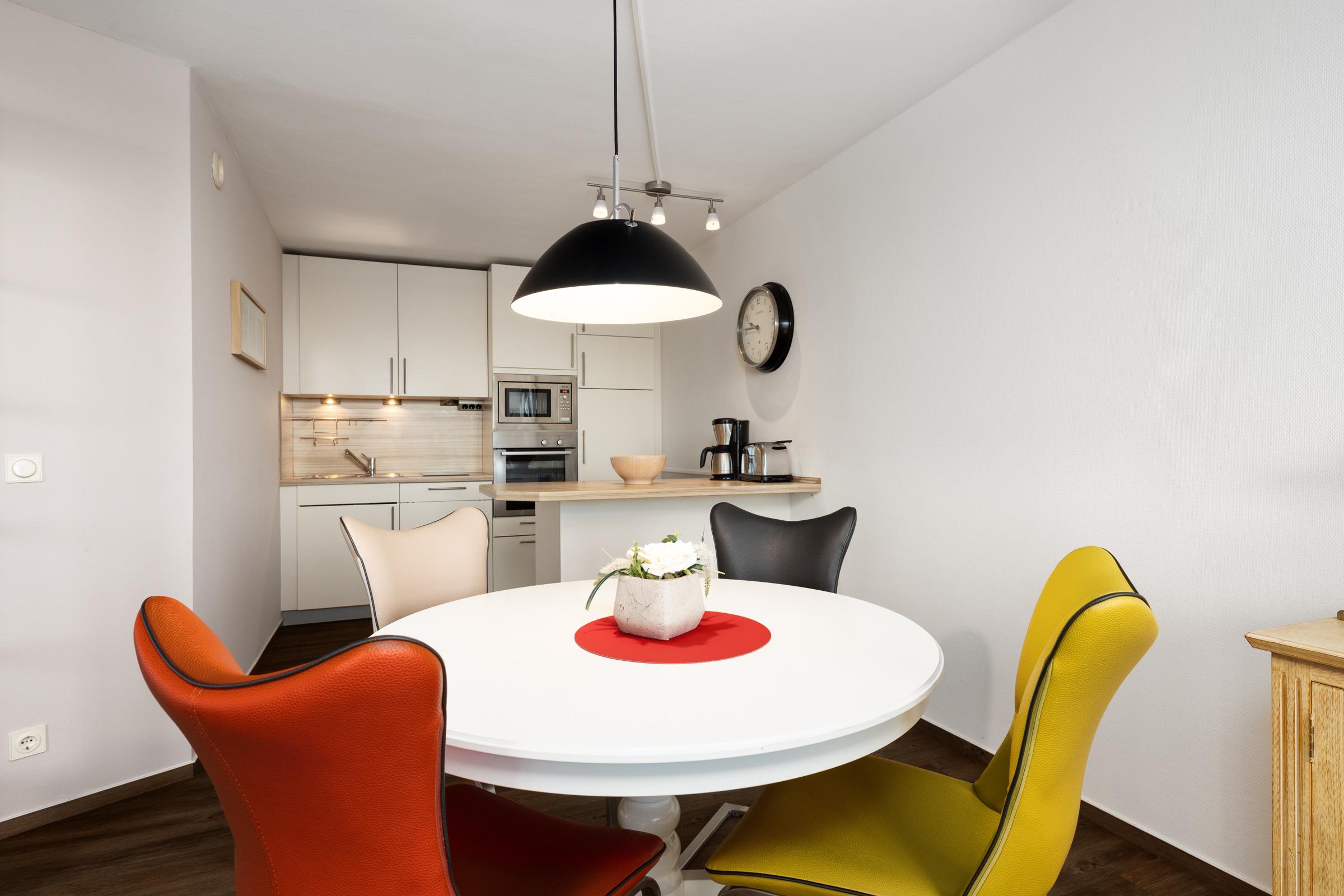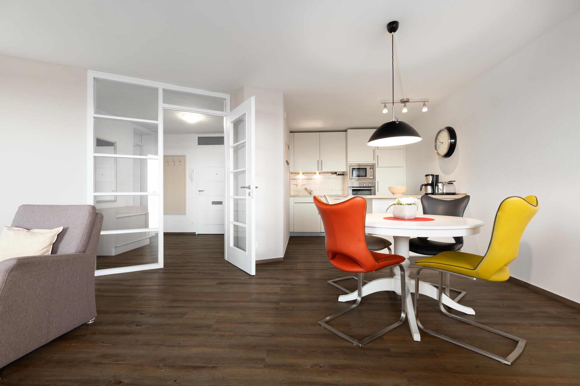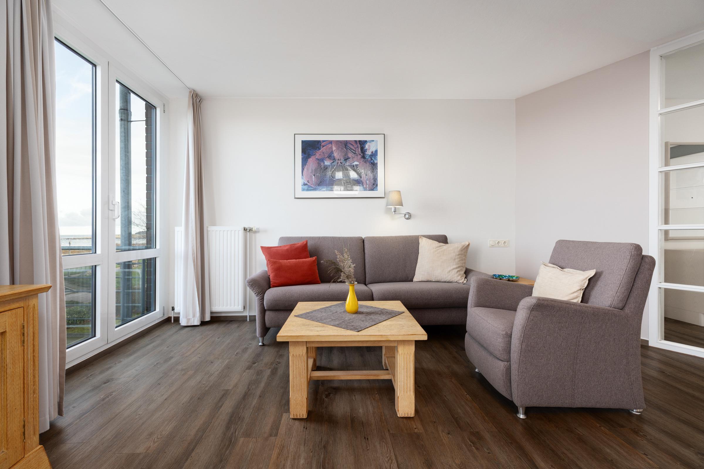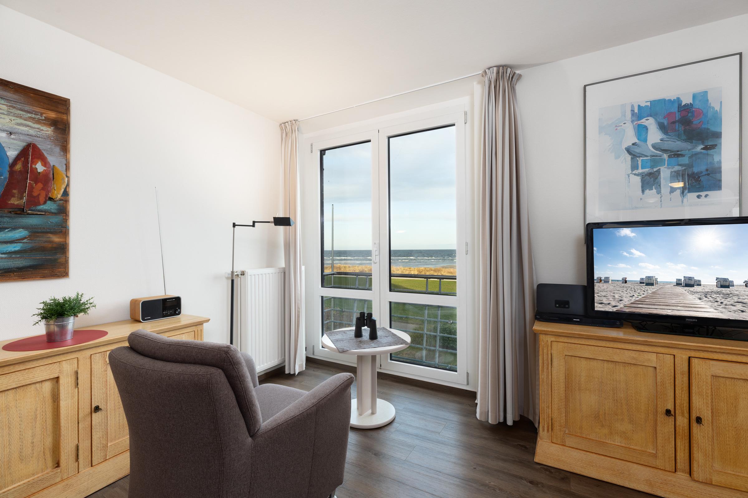 Vom Flur aus gelangen Sie in das mit warmen Farben ausgestattete Wohnzimmer mit moderner und gepflegter Küchenzeile. Diese wird geschmackvoll durch einen Tresen vom Wohnzimmer separiert. Der TV empfängt nur über DVBT-2 HD (öffentlich-rechtliche + private Programme in HD). Der Essplatz befindet sich praktischerweise nahe der Küche und bereits von hier aus genießen Sie den freien Blick auf die typische Dünenlandschaft und das Meer.
