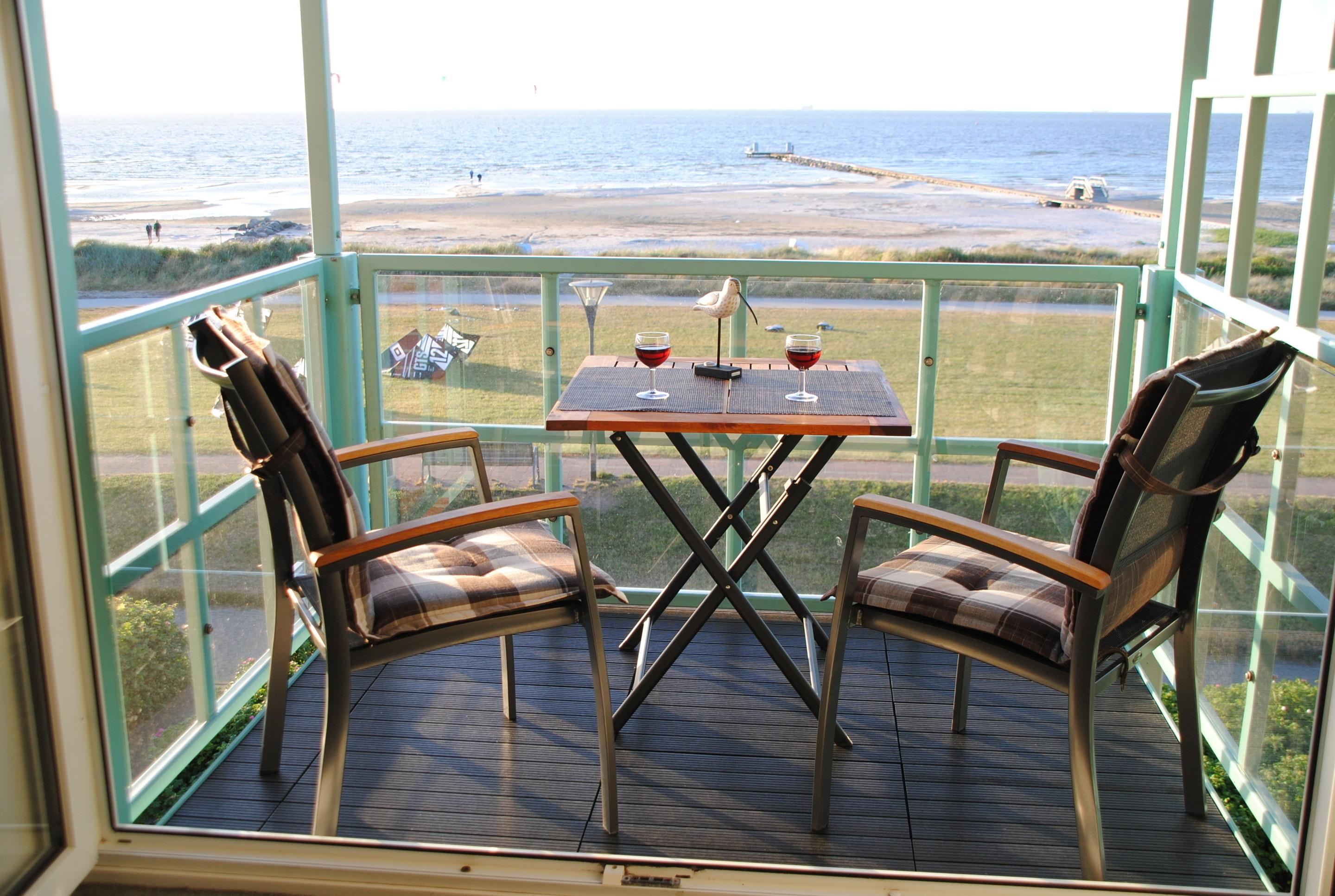 Vom Balkon des Appartements "Fördeblick" genießen Sie den ganzen Tag den Blick auf den Strand und die schöne Kieler Förde.