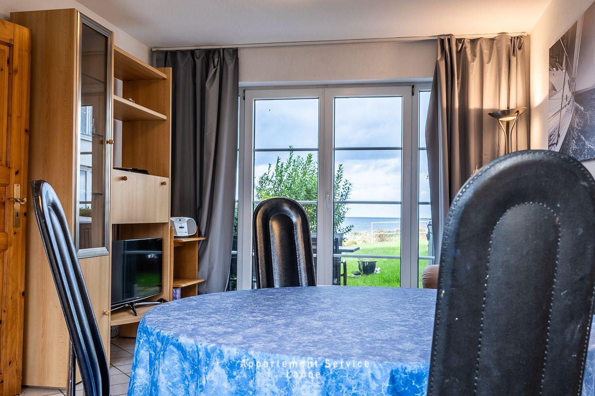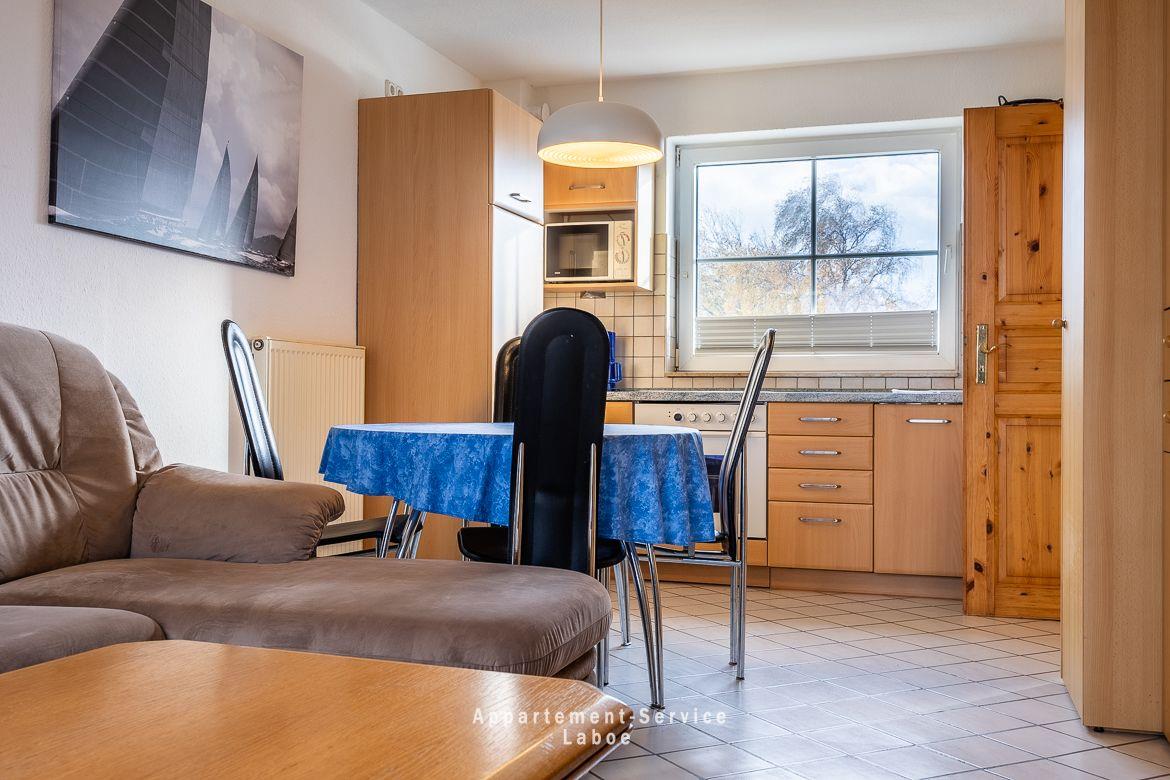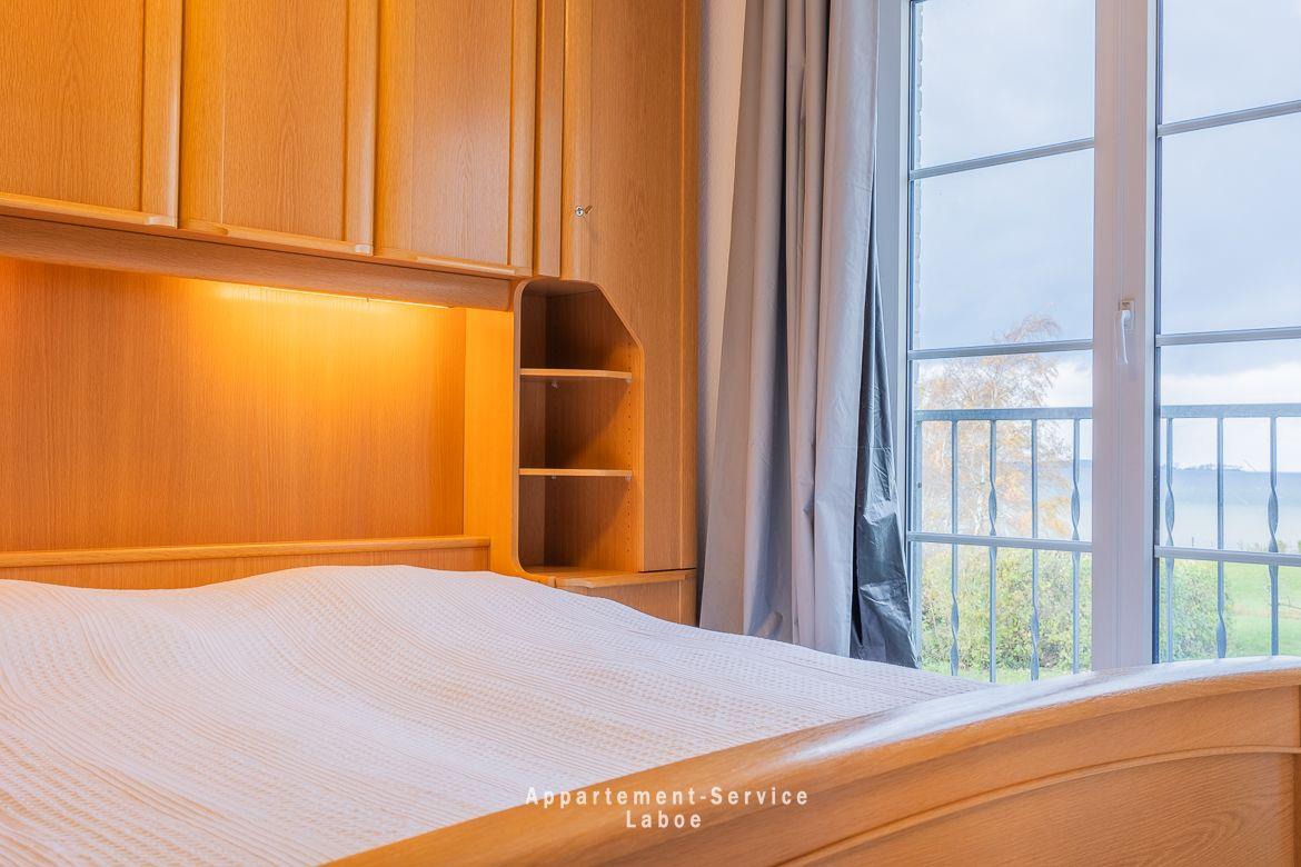 Das Apartment bietet auf 40 Quadratmetern Platz für bis zu vier Personen. Es ist einfach, aber gepflegt eingerichtet – der eigentliche Luxus liegt hier draußen: die Nähe zum Wasser und der Ostseeblick, den du, dank der bodentiefen Fenster, sogar direkt vom Bett im Schlafzimmer genießen kannst.