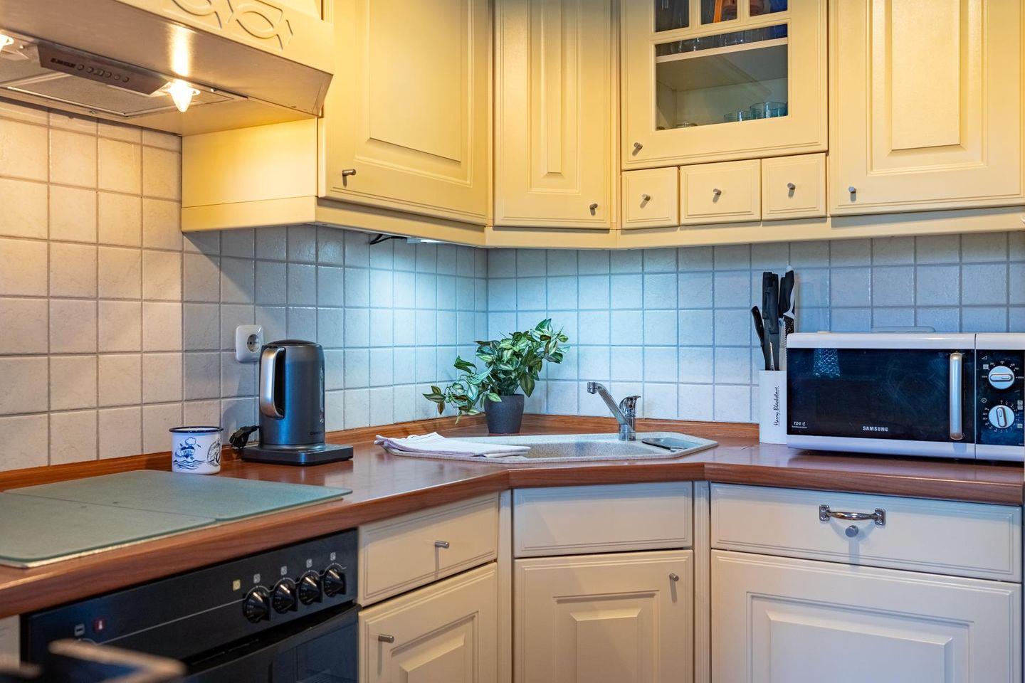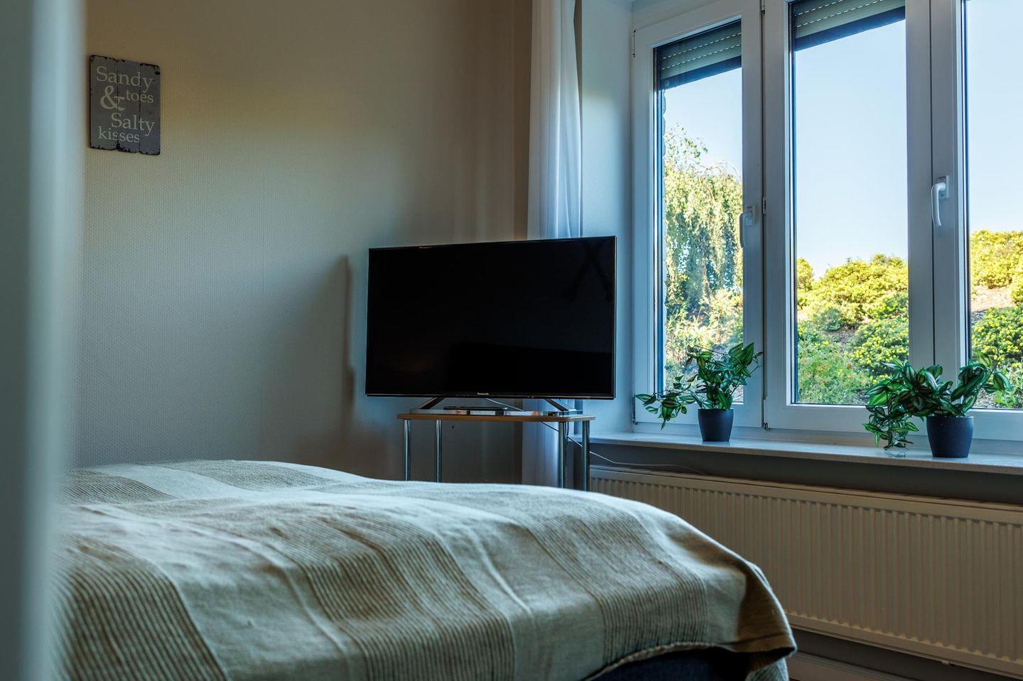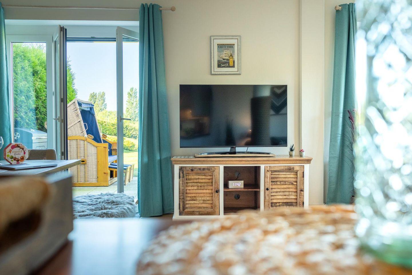 Das lichtdurchflutete Wohnzimmer lädt mit seiner gemütlichen Sitzgruppe, einem TV, einer Stereoanlage und einem DVD-Player zum Ausspannen ein. Hier kannst du es dir nach einem langen Strandspaziergang so richtig gemütlich machen. Die voll ausgestattete Küche bietet mit Geschirrspüler, Cerankochfeld, Backofen, Kühlschrank und einem praktischen Essplatz alles, was du brauchst – egal ob für den schnellen Snack oder das selbstgekochte Abendessen mit Meerblick.