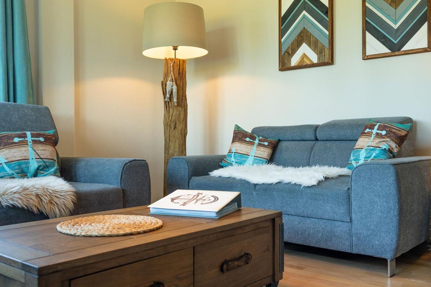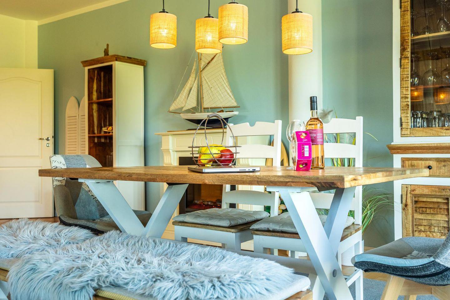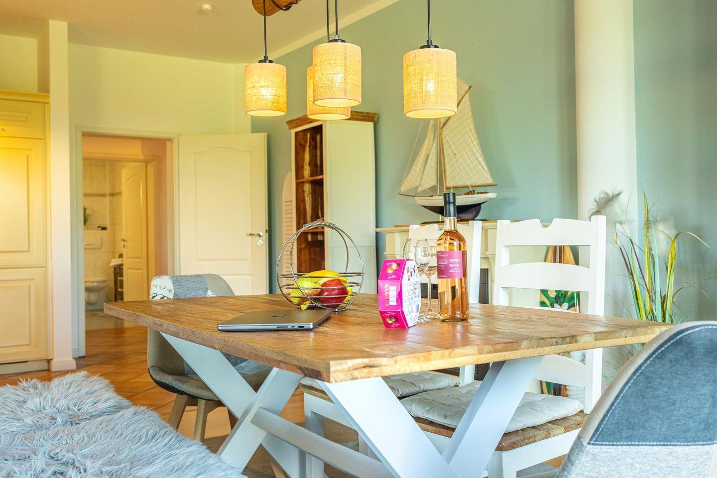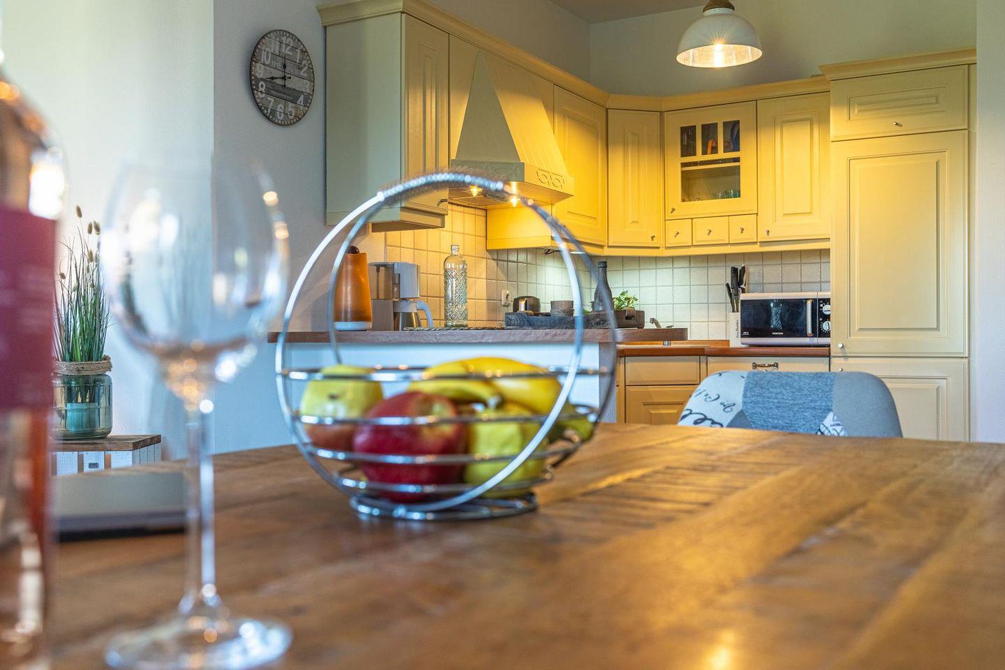 Das lichtdurchflutete Wohnzimmer lädt mit seiner gemütlichen Sitzgruppe, einem TV, einer Stereoanlage und einem DVD-Player zum Ausspannen ein. Hier kannst du es dir nach einem langen Strandspaziergang so richtig gemütlich machen. Die voll ausgestattete Küche bietet mit Geschirrspüler, Cerankochfeld, Backofen, Kühlschrank und einem praktischen Essplatz alles, was du brauchst – egal ob für den schnellen Snack oder das selbstgekochte Abendessen mit Meerblick.