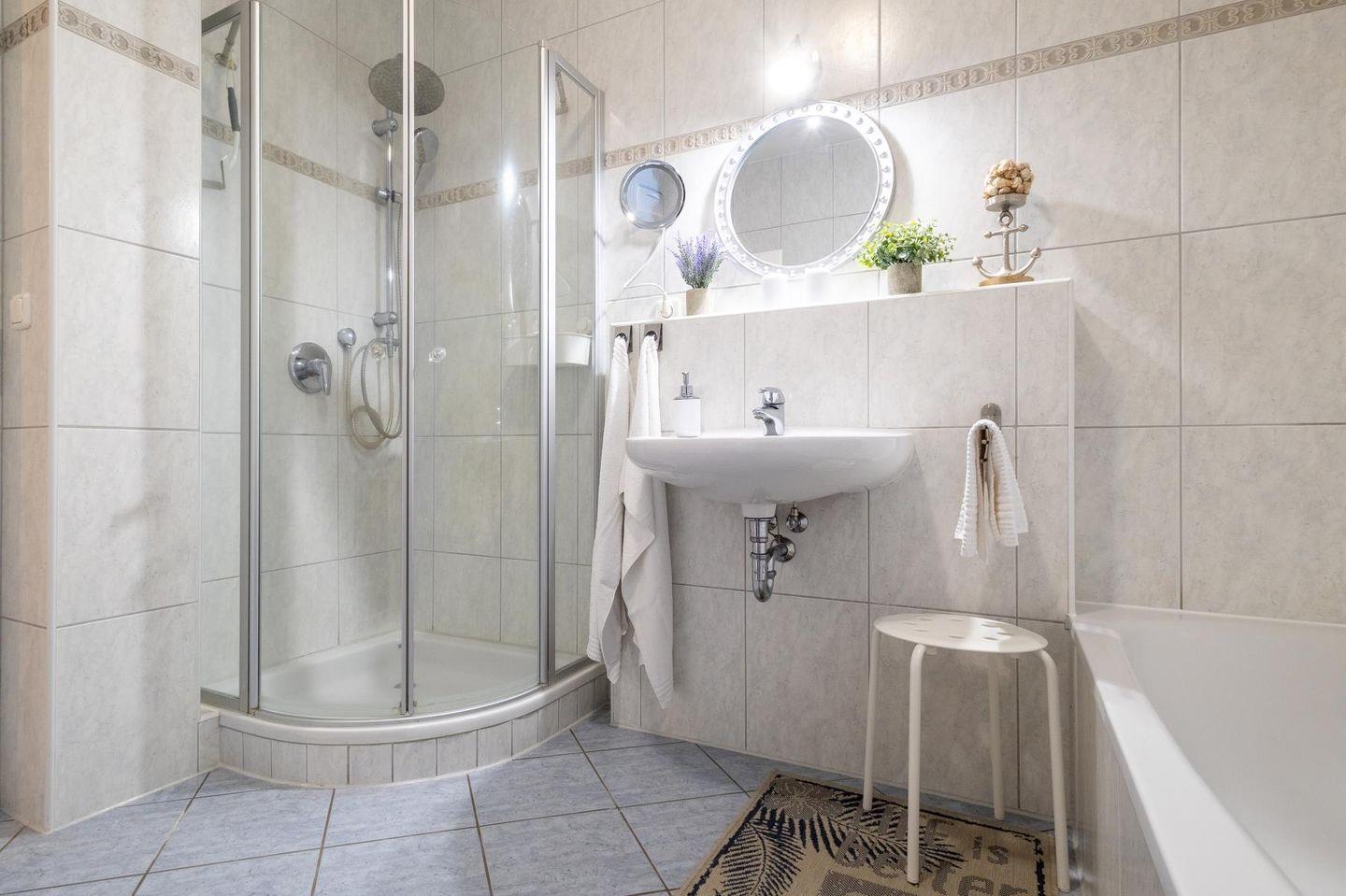 Zwei Schlafzimmer mit hochwertigen Boxspringbetten und jeweils eigenem Fernseher bieten dir und deinen Mitreisenden viel Ruhe und Komfort. Ein geräumiger Flur mit Garderobe führt ins Badezimmer. Es überzeugt mit Dusche, Badewanne und WC – gepflegt und einladend, genau richtig für den Start in den Tag oder ein warmes Bad zum Runterkommen.