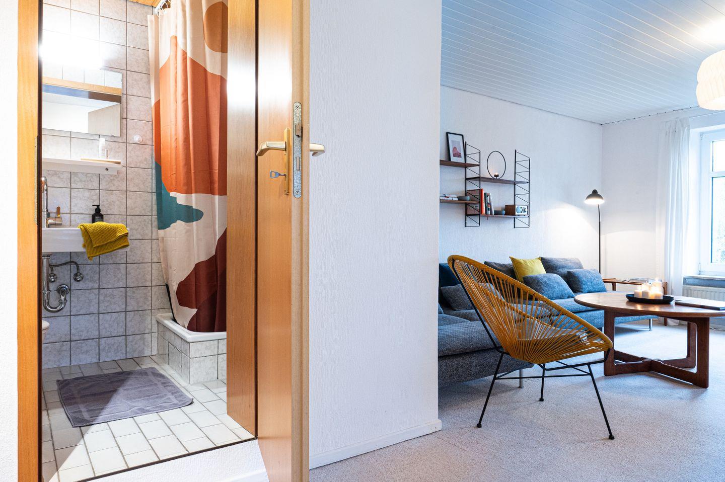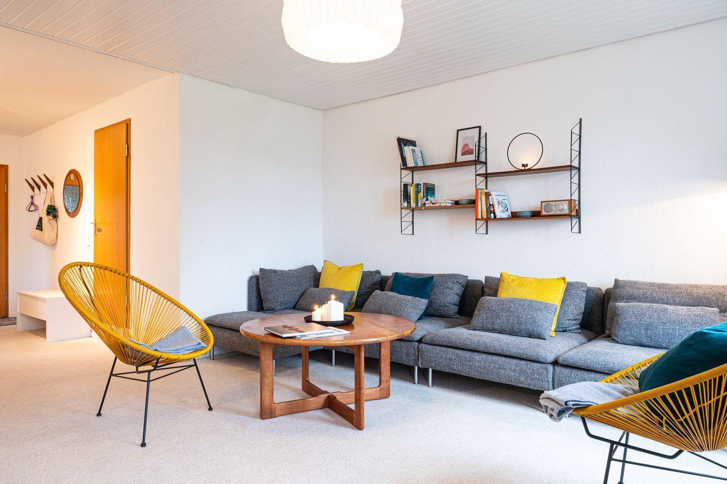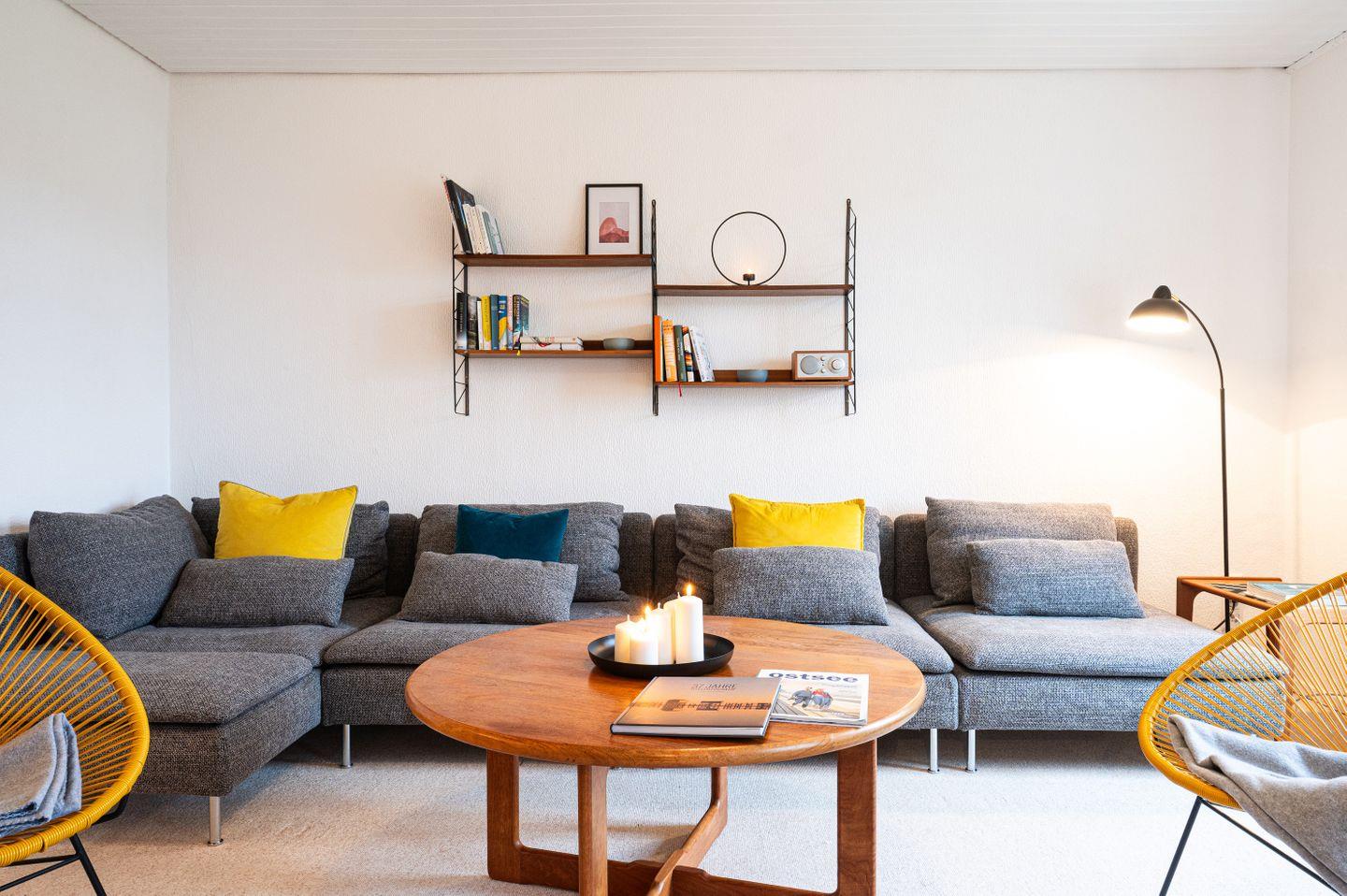Die Groote Stuuv besticht durch ihre funktionale, gut durchdachte Gestaltung im Mid-Century-Stil und liegt im 1.Obergesschoss. Reduziertes Design, klare Formen und hochwertige Materialien schaffen eine harmonische Atmosphäre, die Ästhetik und Komfort perfekt verbindet. Große Fenster lassen viel Licht herein und bieten Blick auf das weitläufige Außengelände. Der offene Wohnbereich und die separate Küche lädt zum Entspannen, Kochen und gemeinsamen Beisammensein ein. Die beiden Schlafzimmer sind zweckmäßig eingerichtet und sorgen für erholsame Nächte. Ein Schlafzimmer verfügt über ein großes Doppelbett (180x200 cm), das zweite Schlafzimmer verfügt über zwei Einzelbetten (je 90x200 cm).