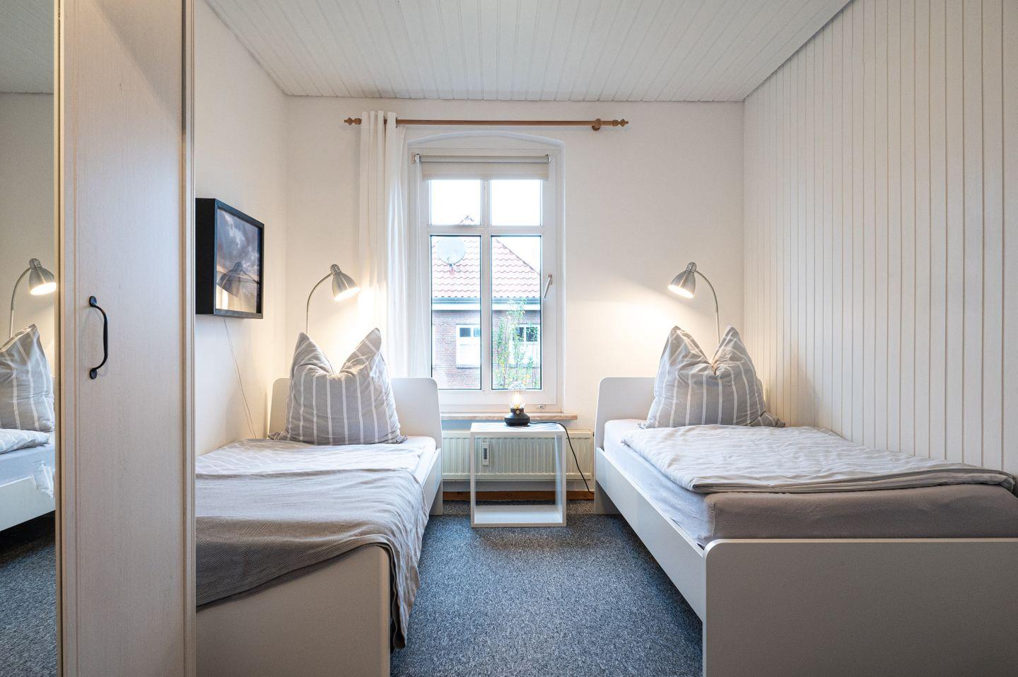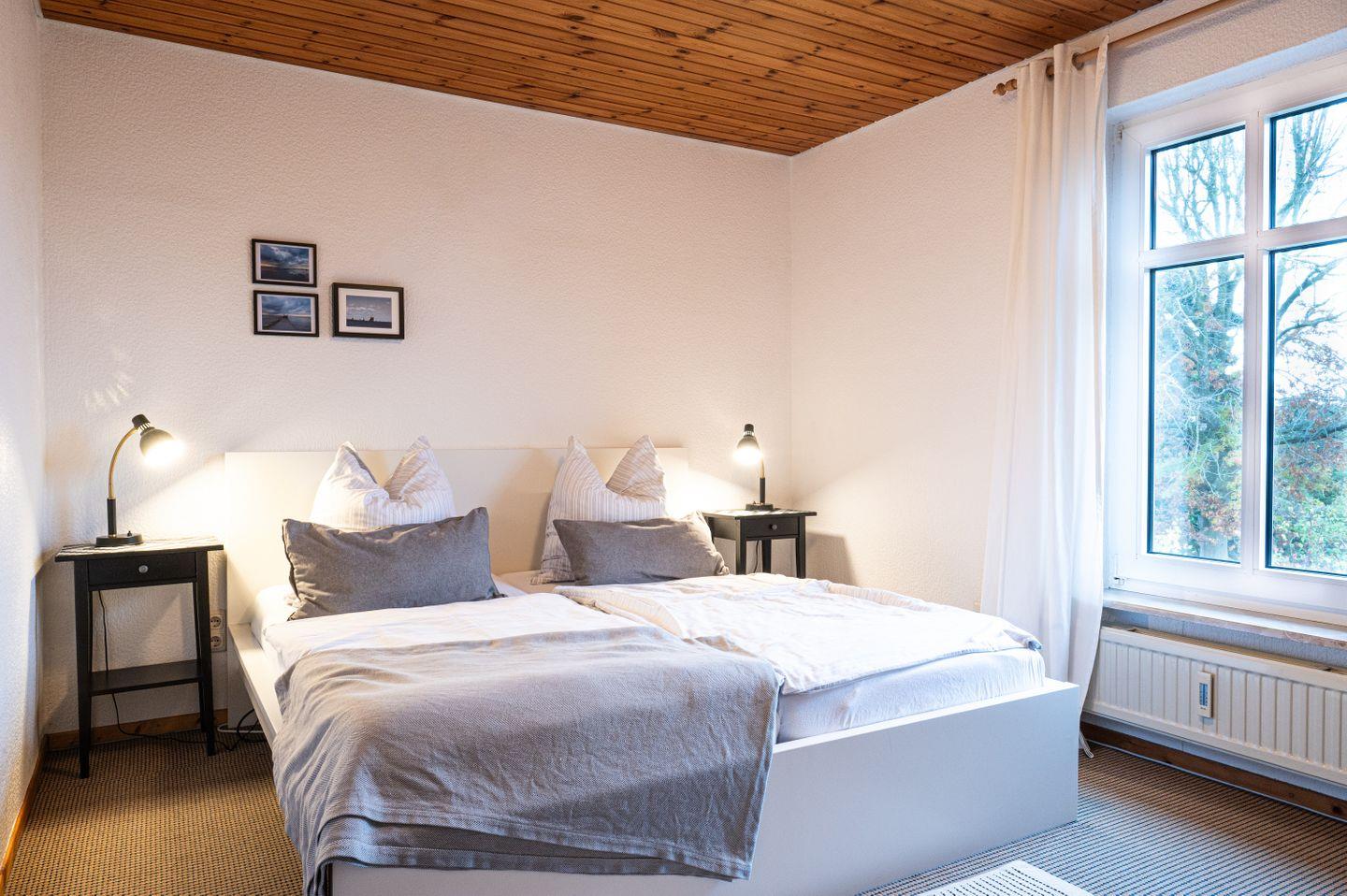 Die Ferienwohnung für 4 Personen ist ca. 66m² groß. Ein Schlafzimmer verfügt über ein großes Doppelbett (180x200 cm), das zweite Schlafzimmer verfügt über zwei Einzelbetten (je 90x200 cm).