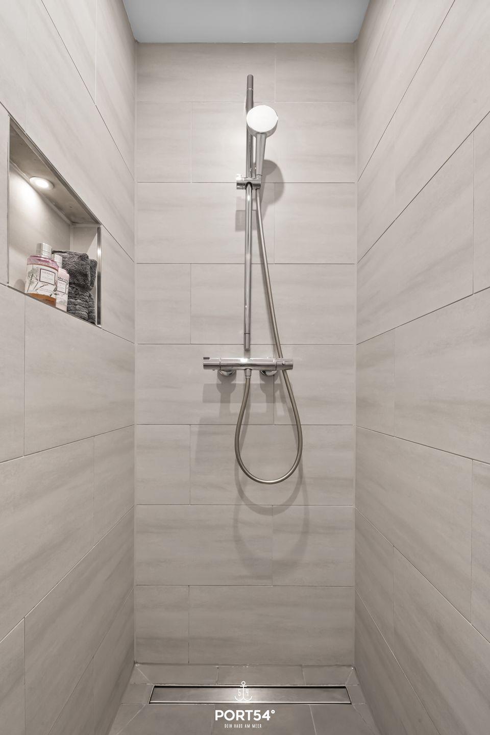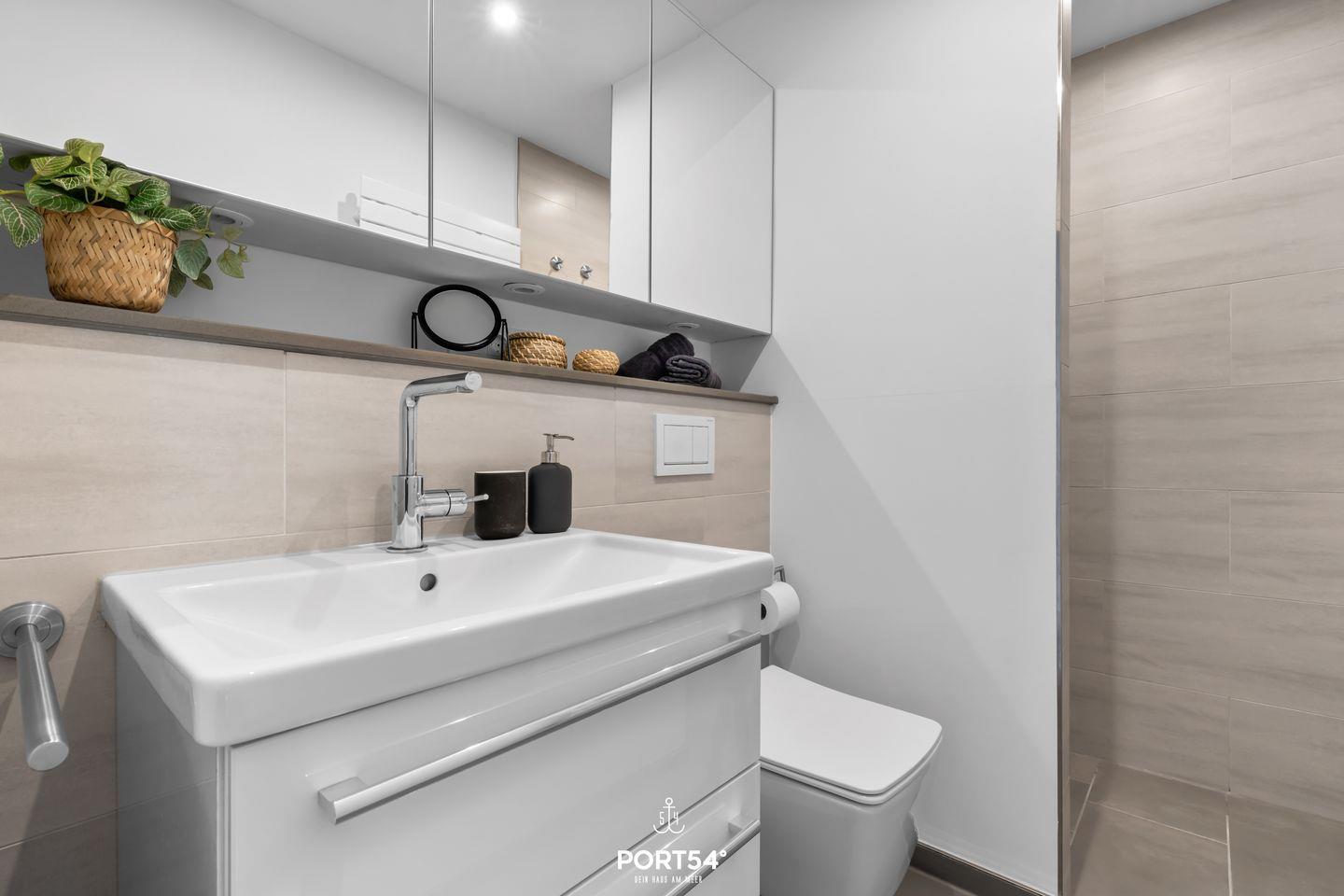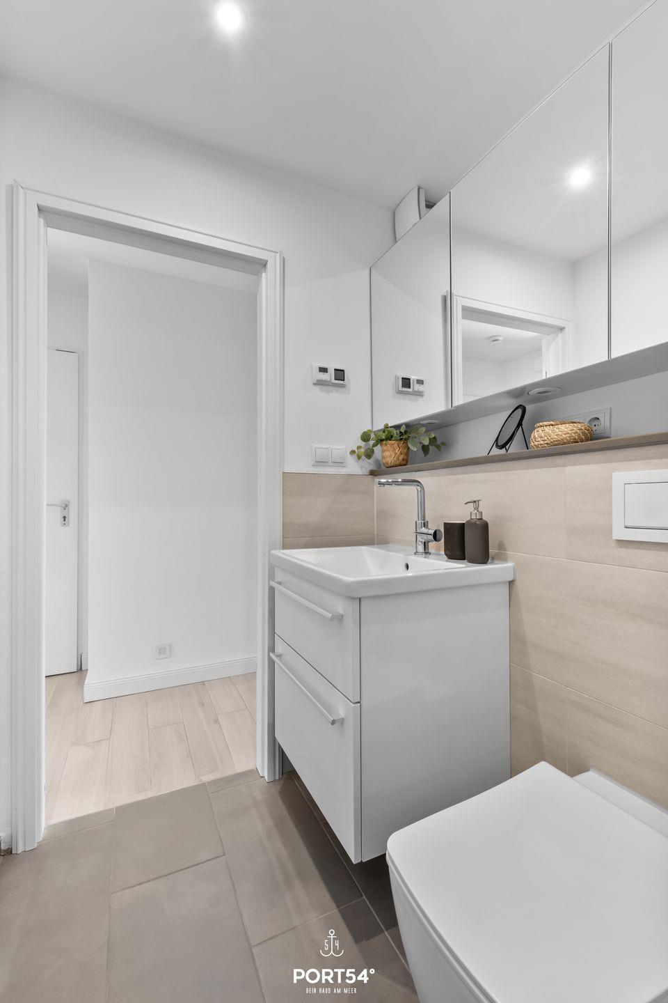 Das Badezimmer ist mit einer bodengleichen Dusche und modernen sanitären Anlagen, einschließlich Waschbecken und WC, ausgestattet. Eine Waschmaschine und ein Trockner stehen zur gemeinschaftlichen Nutzung in der Unterkunft zur Verfügung und ermöglichen somit auch längere Aufenthalte.