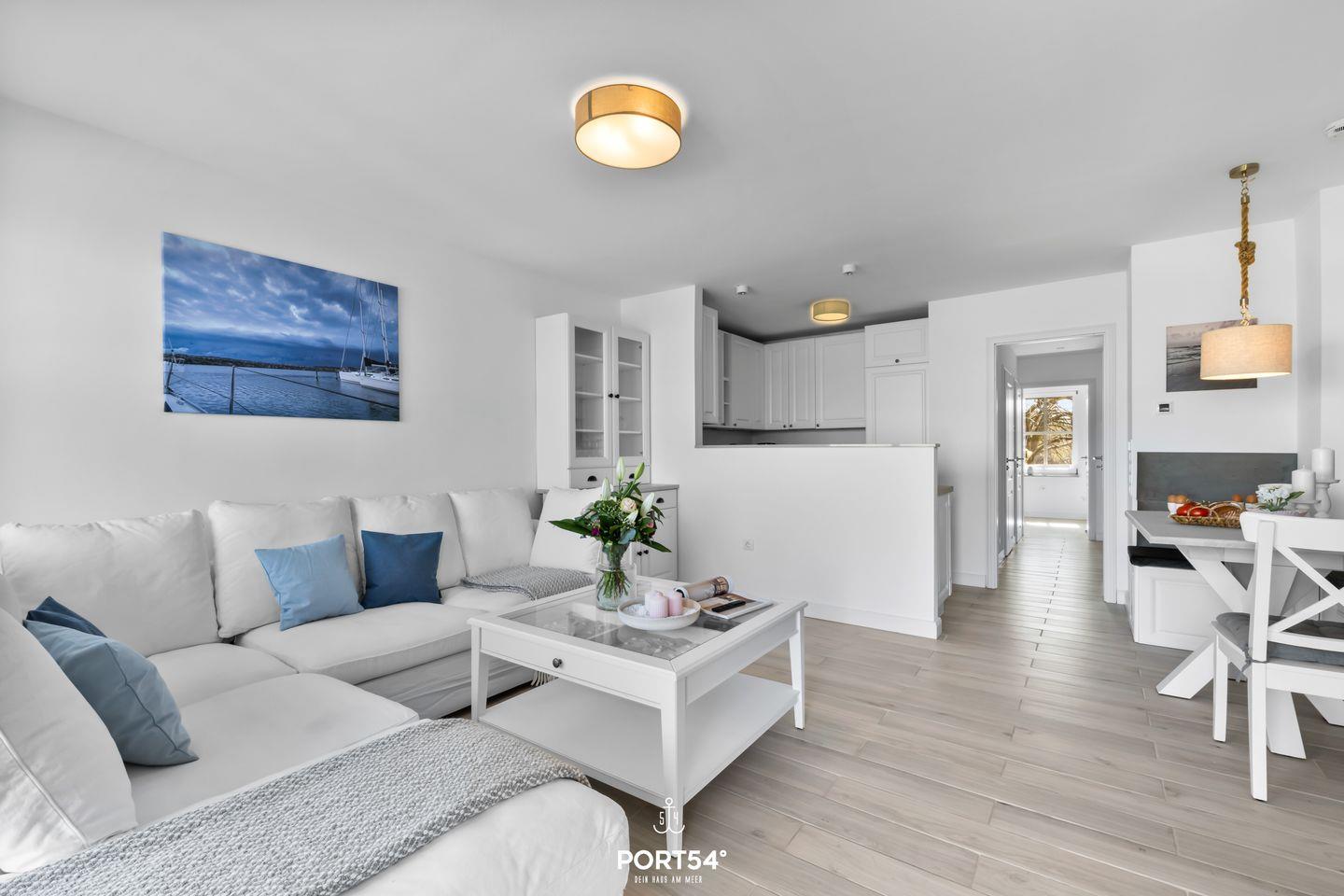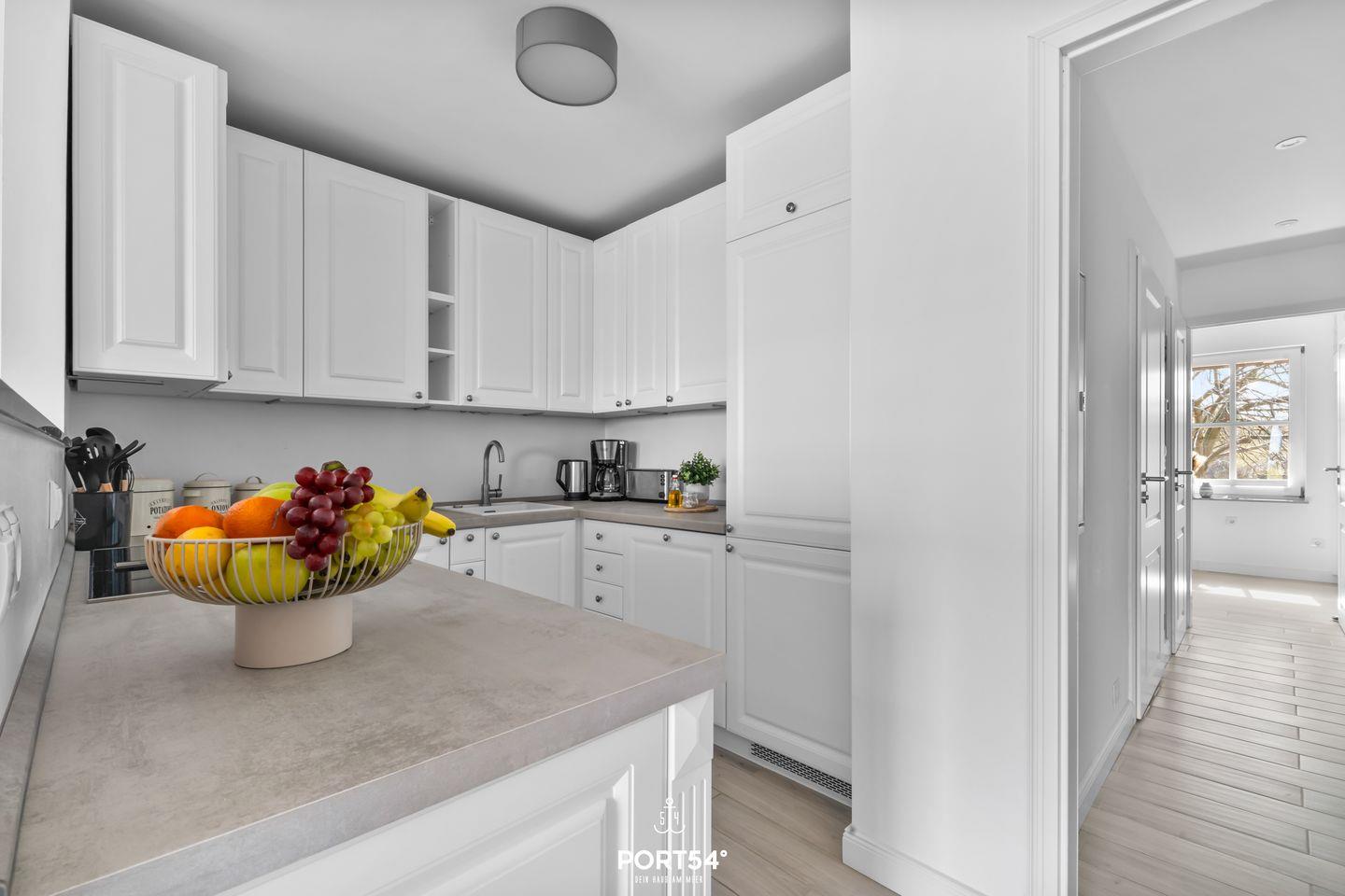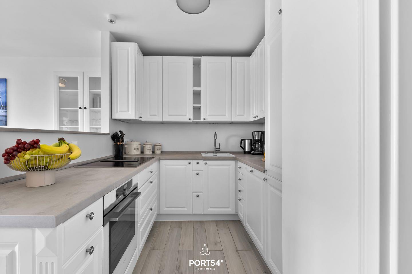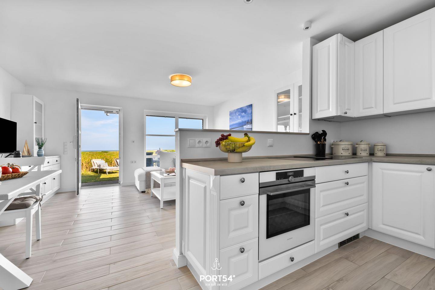Die Ferienwohnung verfügt über ein gemütliches, helles Wohnzimmer, das mit einer komfortablen Sofaecke sowie einem Esstisch ausgestattet ist, an dem Sie gemeinsame Mahlzeiten genießen können. Eine moderne, offene Küche grenzt daran an und ist mit hochwertigen Geräten ausgestattet. Dazu zählen ein Induktionsherd, ein Backofen, eine Spülmaschine, ein Kühlschrank mit Gefrierfach und zahlreiche Küchengeräte wie ein Toaster, ein Wasserkocher und eine Kaffeemaschine. Die komplette Küchenausstattung ermöglicht es Ihnen, ganz nach Belieben zu kochen.