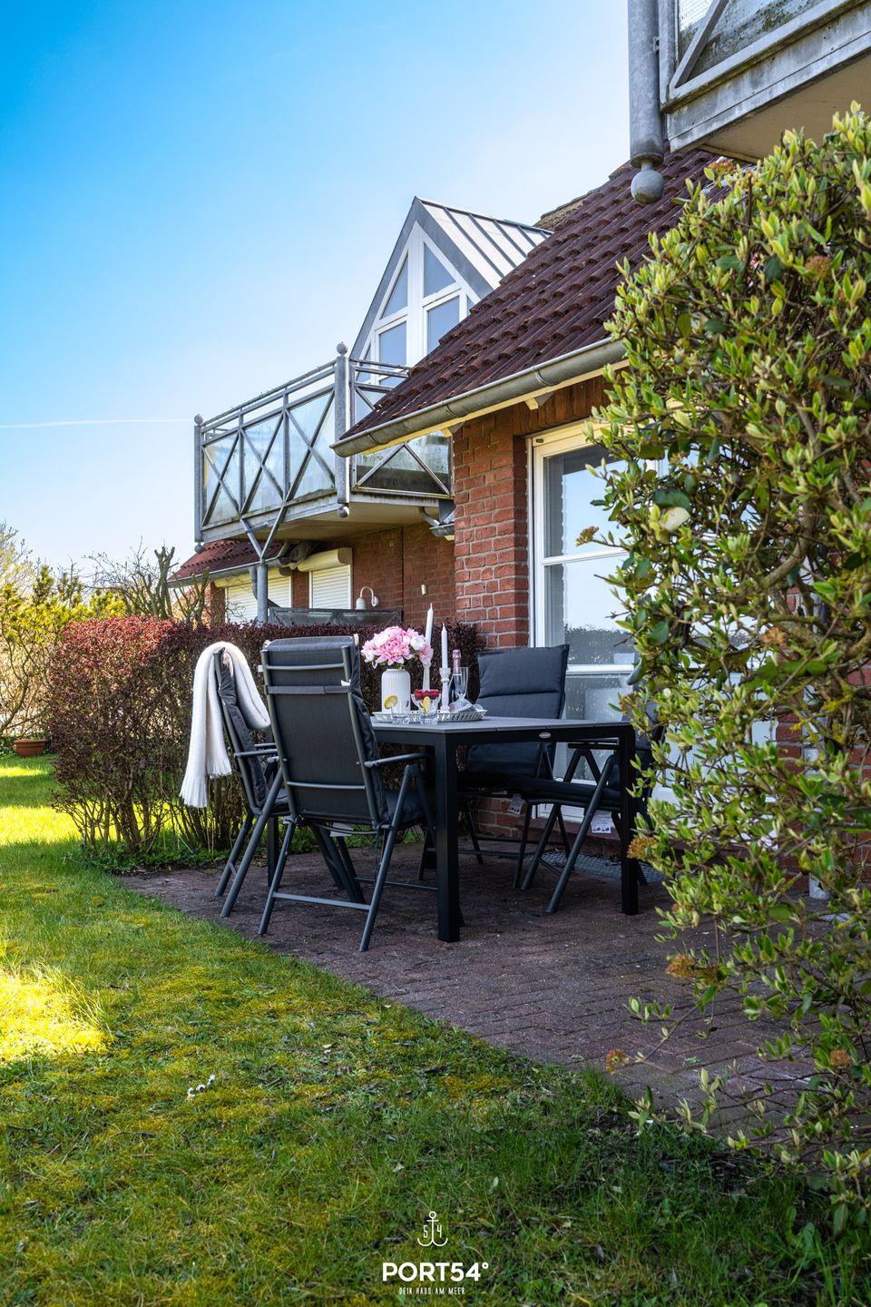 Die Wohnung bietet auch einen Garten, in dem Sie die warmen Tage genießen können. Von hier aus gelangen Sie durch ein Gartentor direkt ans Wasser, den Strand und den Deich. Gartenmöbel laden dazu ein, im Freien zu entspannen. Das Angebot für Gäste wird durch kostenlose WLAN-Nutzung via Glasfaser und einen digitalen Fernseher mit Magenta-TV abgerundet.