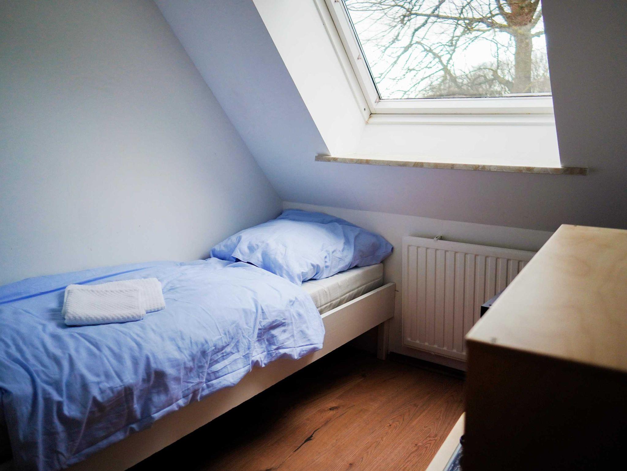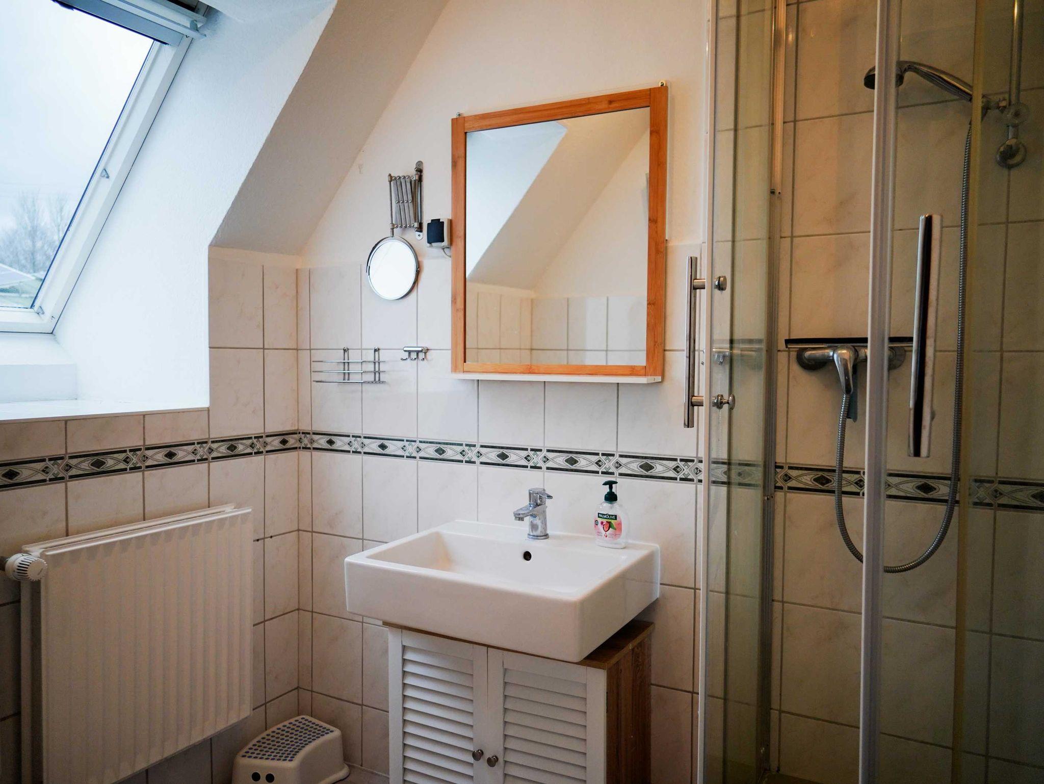 Die 58 qm große Ferienwohnung Kutscherstube liegt in der 1. Etage und hat einen offenen Wohnbereich mit integrierten Dachschrägen und angrenzendem Balkon. Den bis zu 5 Personen stehen ein Wohnraum mit offener Küche, ein Bad mit Dusche und WC sowie drei Schlafzimmer zur Verfügung (1x mit Doppelbett, 1x mit Etagenbett, 1x Einzelbett).