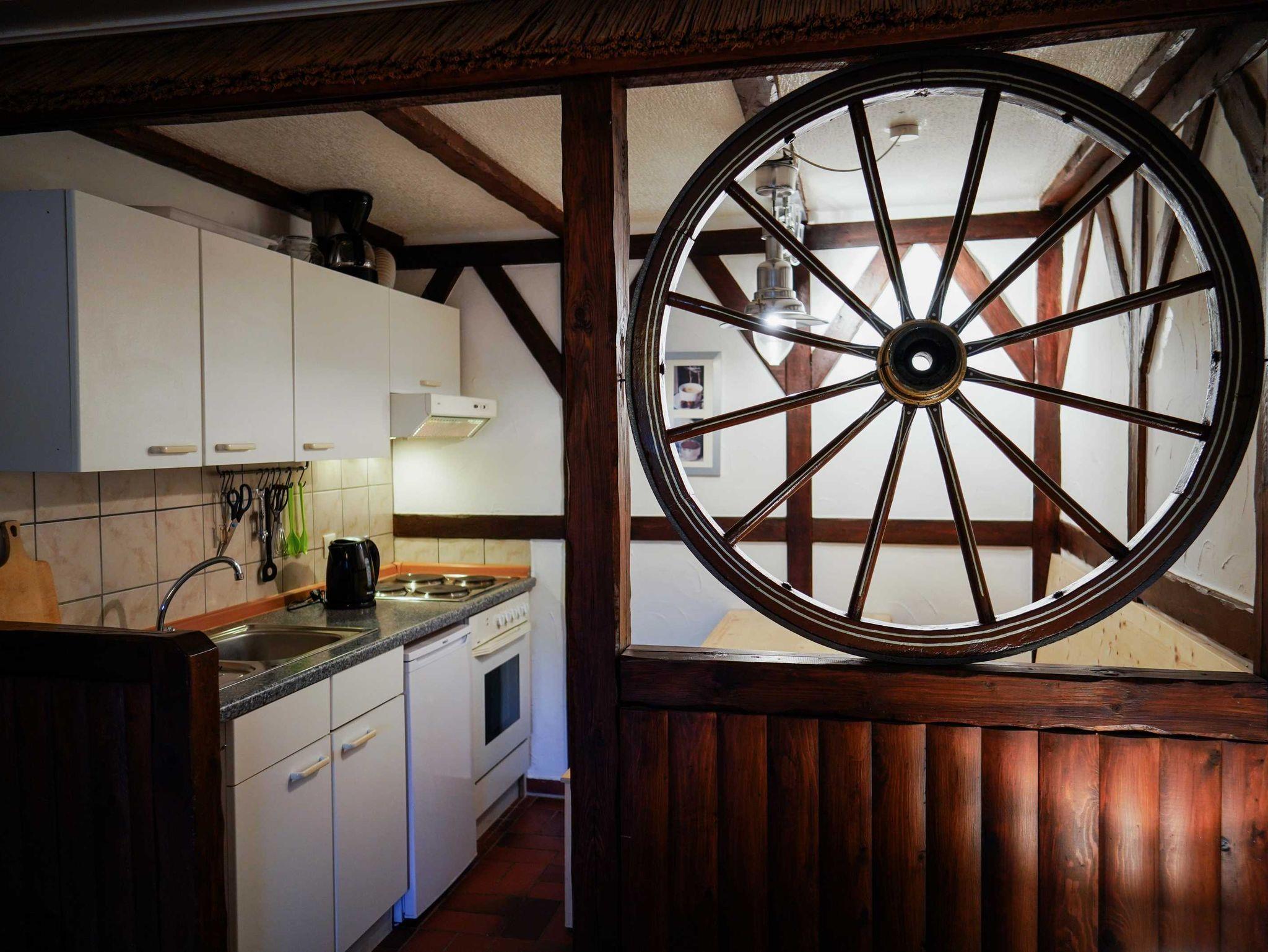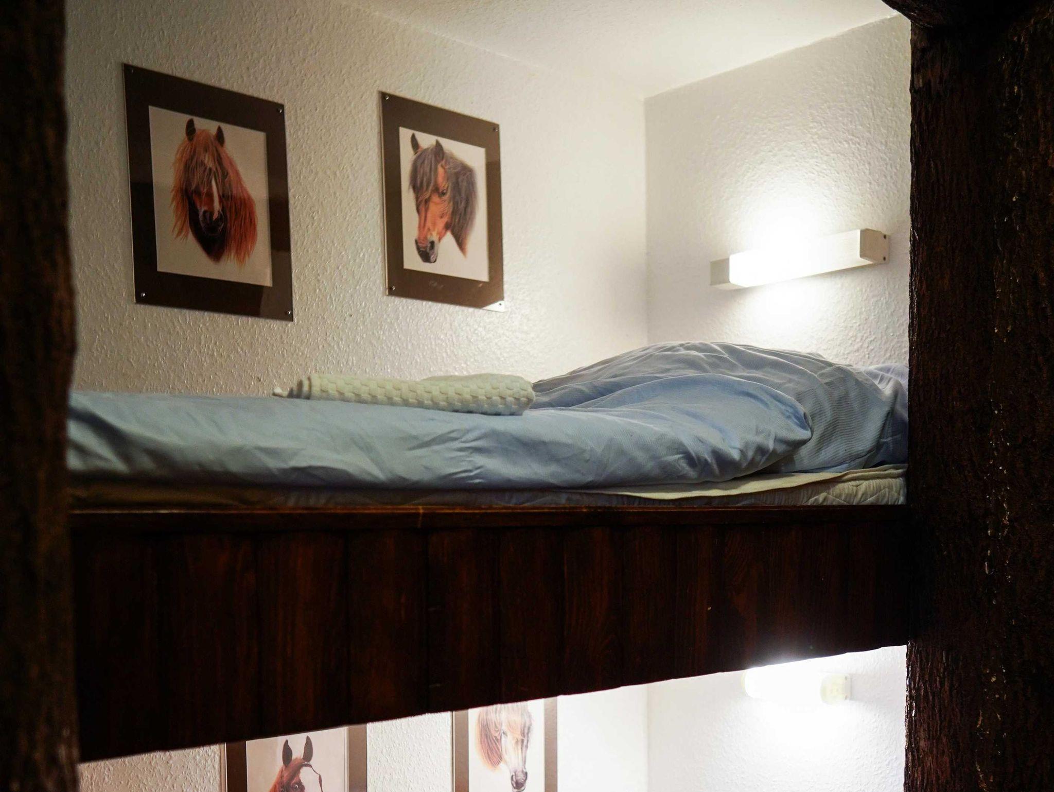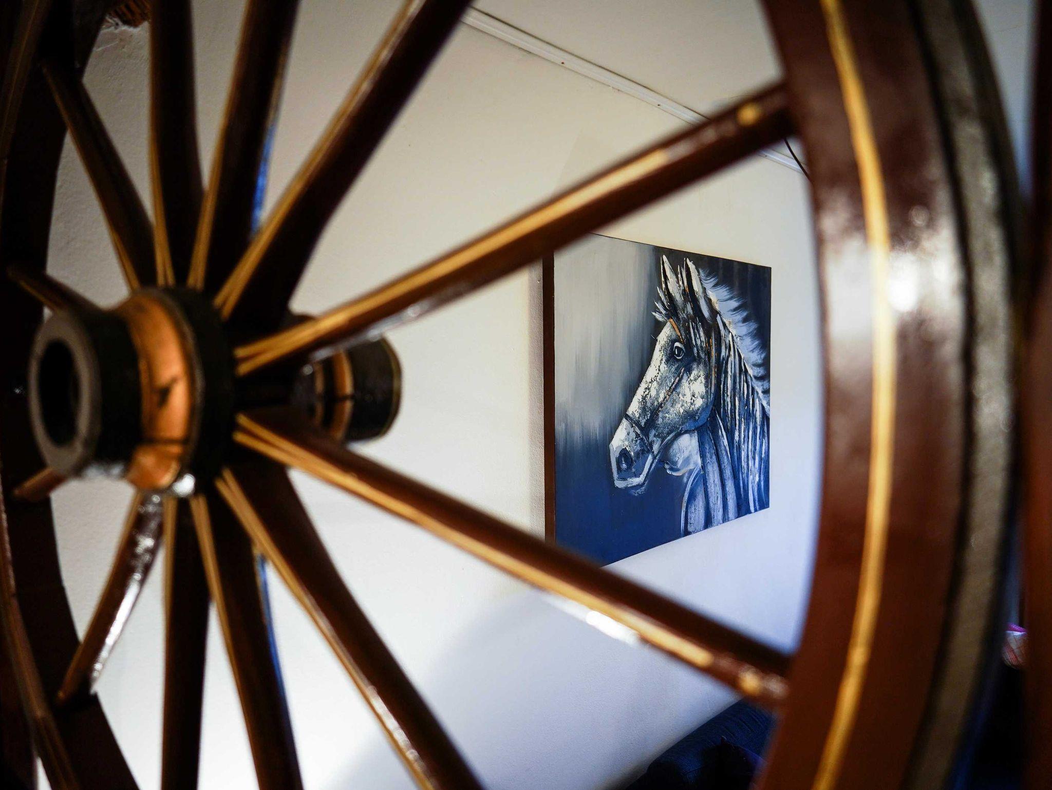 Die 42 qm große Ferienwohnung Reiterstube liegt im Erdgeschoss. Das verarbeitete Holz und das Wagenrad sorgen für eine gemütlich urige Atmosphäre. Die Wohnung verfügt über einen Wohnraum mit Küche und Essecke, ein Elternschlafzimmer mit Doppelbett, einen Etagenalkoven Betten für die Kinder sowie ein Bad mit Dusche und WC. Die eigene Terrasse mit Blick auf den Reitplatz lädt zum Verweilen ein.