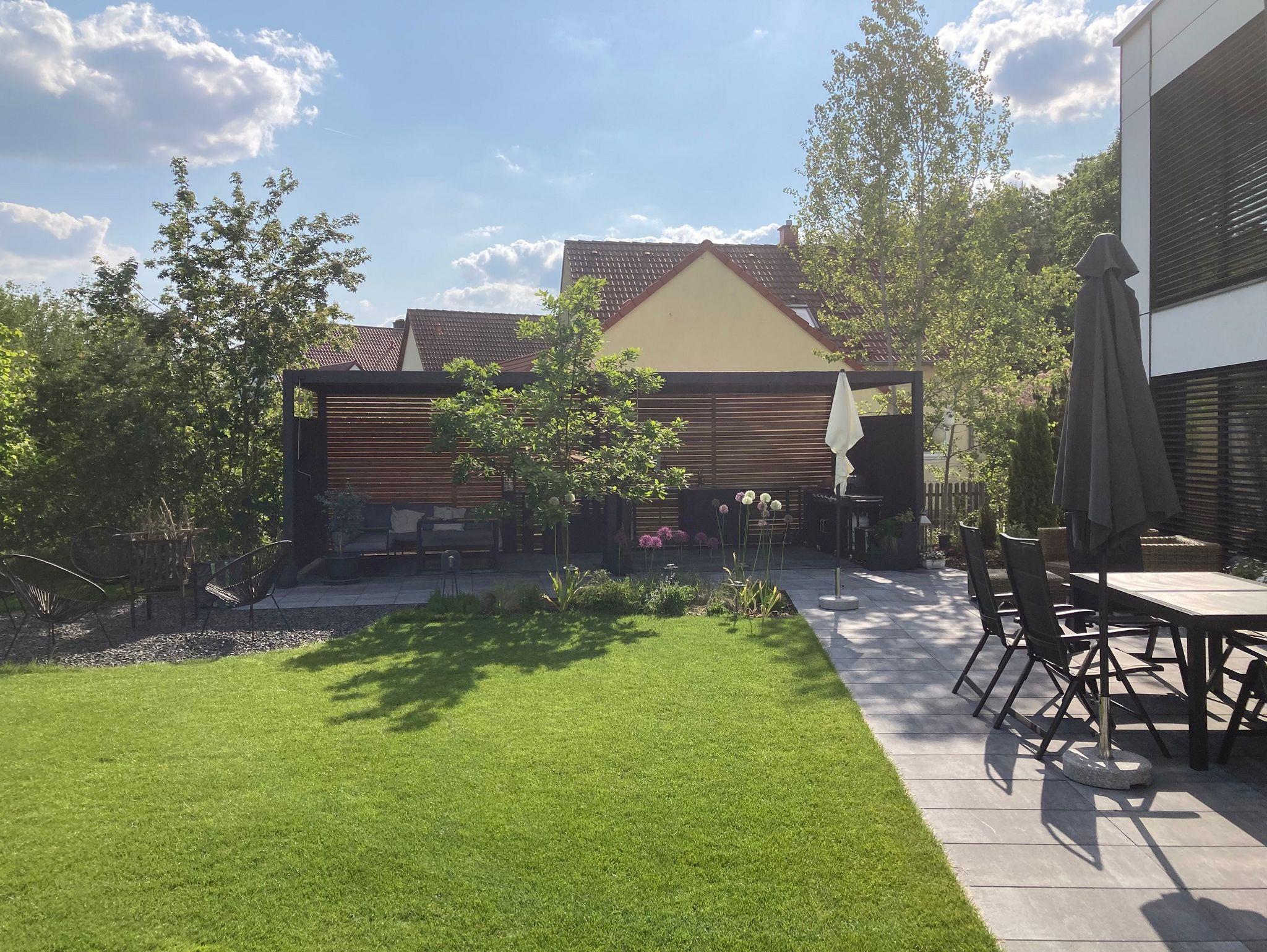 Es erwartet Sie ein großzügiger Gartenbereich mit großer Terrasse, zum Teil mit großem Pavillon überdacht. Zum Entspannen stehen
