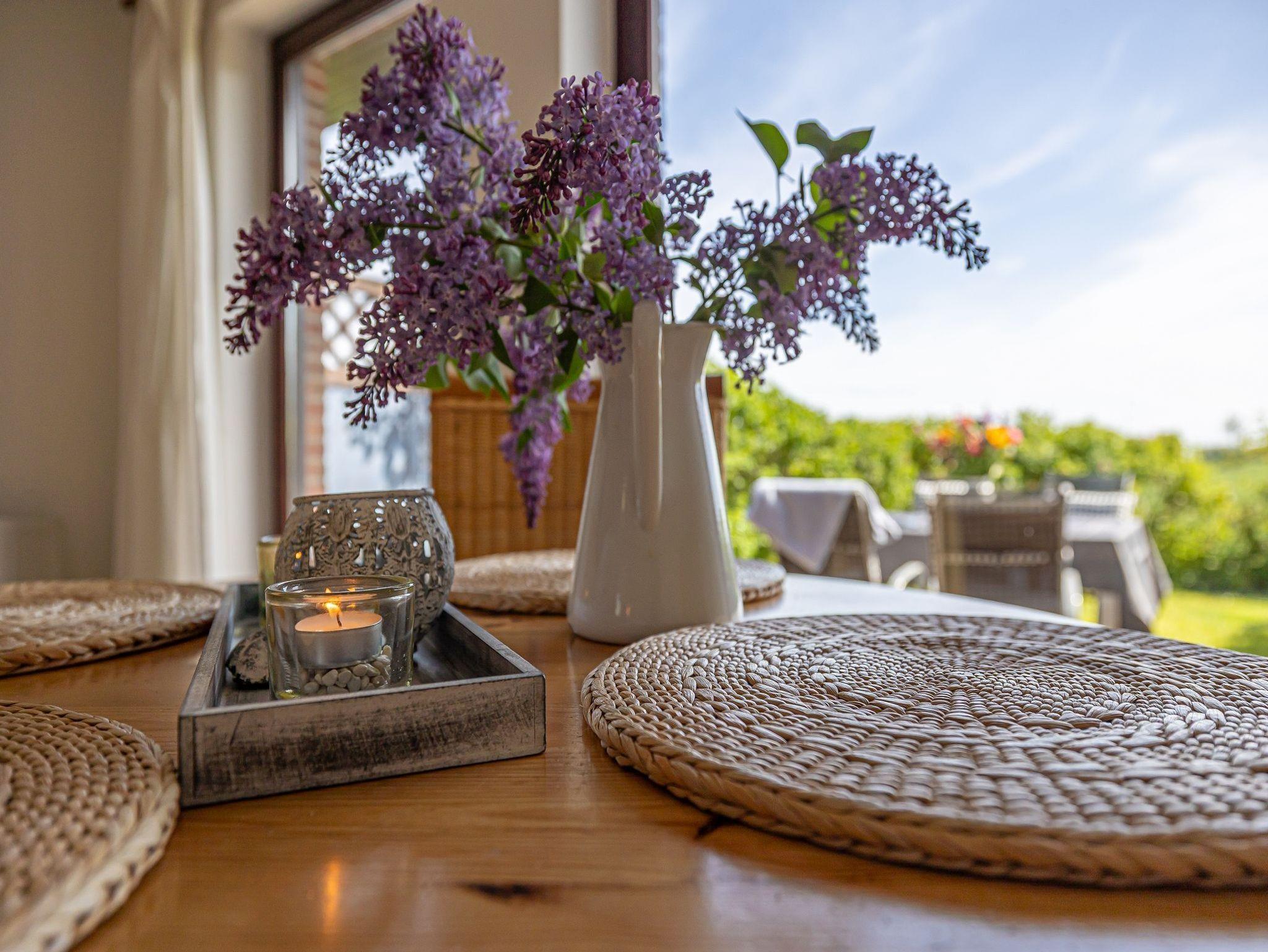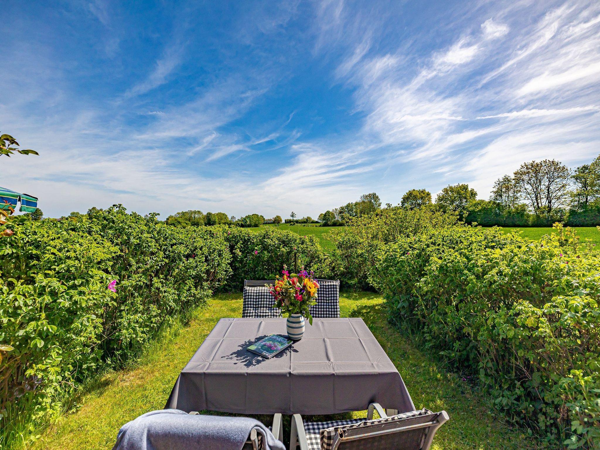 Fünf Ferienwohnungen reihen sich nahtlos aneinander. Jede hat einen separaten Eingang und eine eigene Terrasse mit Gartenmöbeln und Grill. Der Panoramablick zeigt Ihnen die Wiesen und Weiden Richtung Meer.