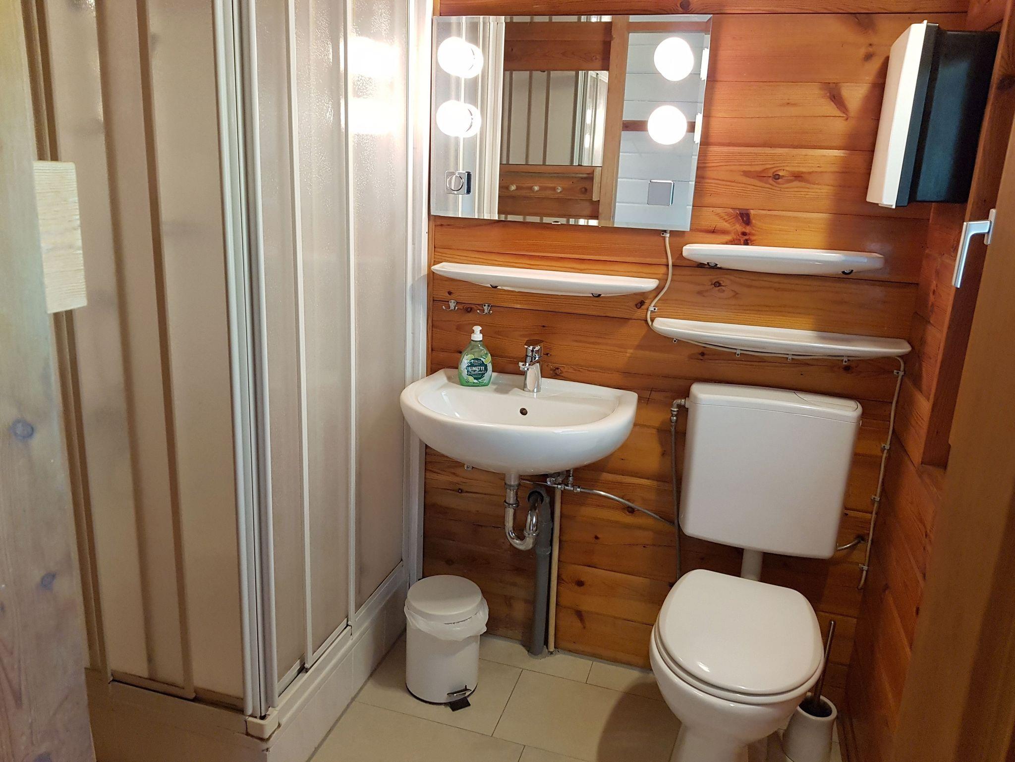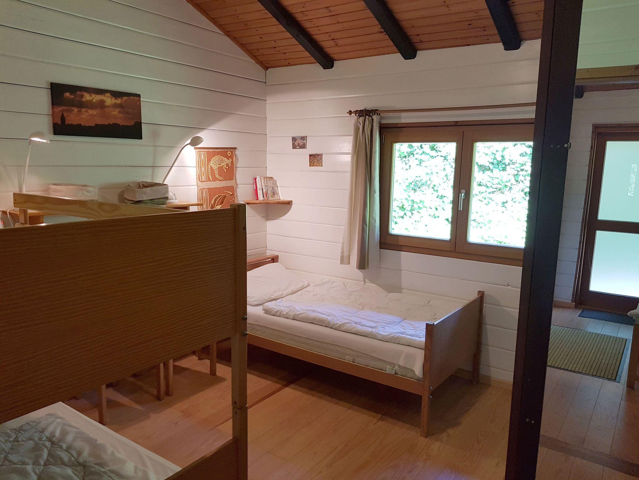 Das Blockhaus ist 54qm groß und bietet Schlafmöglichkeiten für 5 Personen. Es verfügt neben einem Schlafzimmer mit Doppelbett über ein Schlaf-/ oder Kinderzimmer mit Etagen- und Einzelbett sowie wahlweise zusätzlichem Kinderbett. Über den Flur erreicht man den Wohnbereich mit Südterrasse, integrierter Küche und Esstisch sowie das Badezimmer.