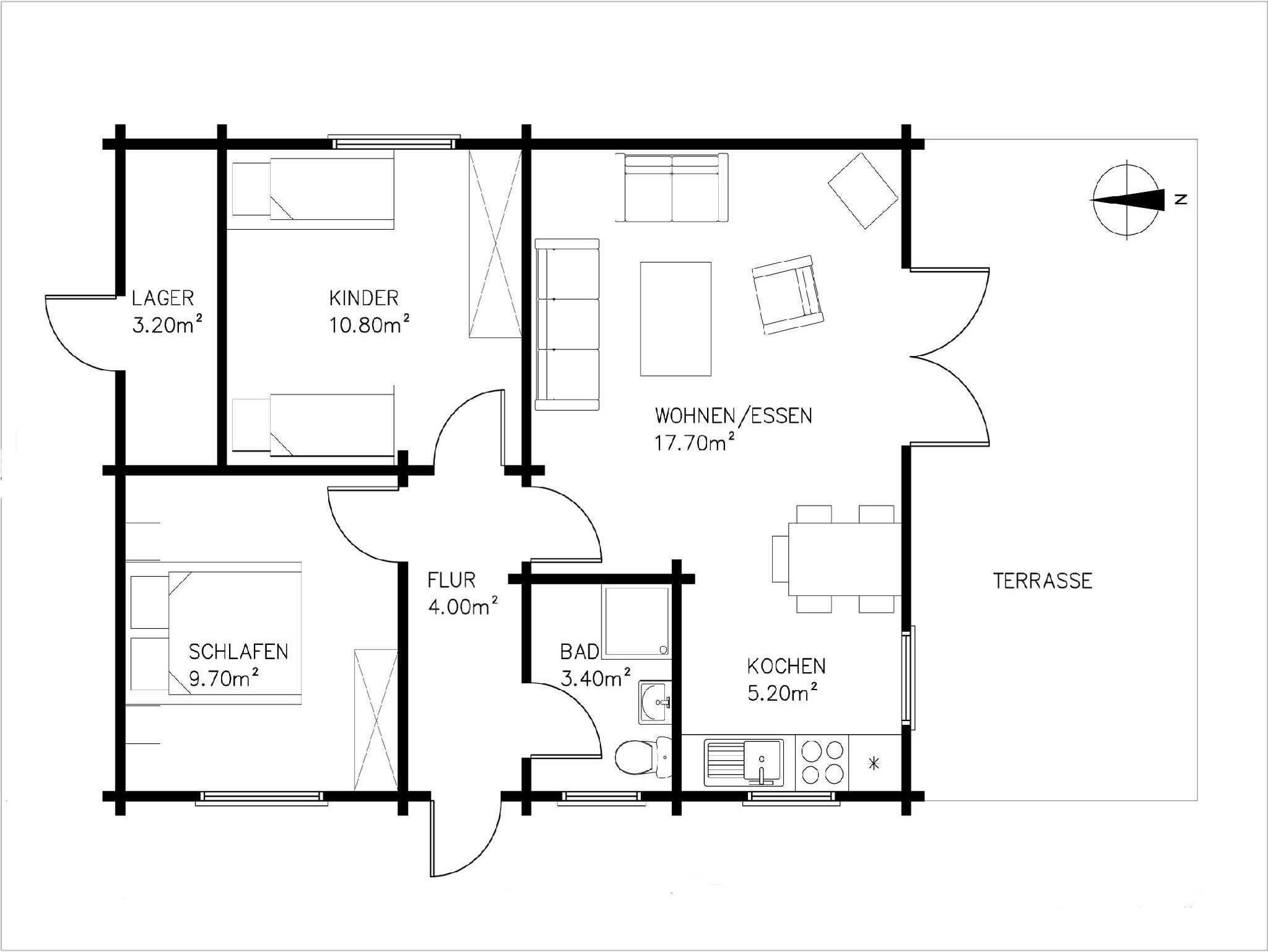Ausstattung Das Ferien-Blockhaus ist 54 qm groß und für 5 Personen ausgestattet. Es ist gemütlich und komfortabel eingerichtet.