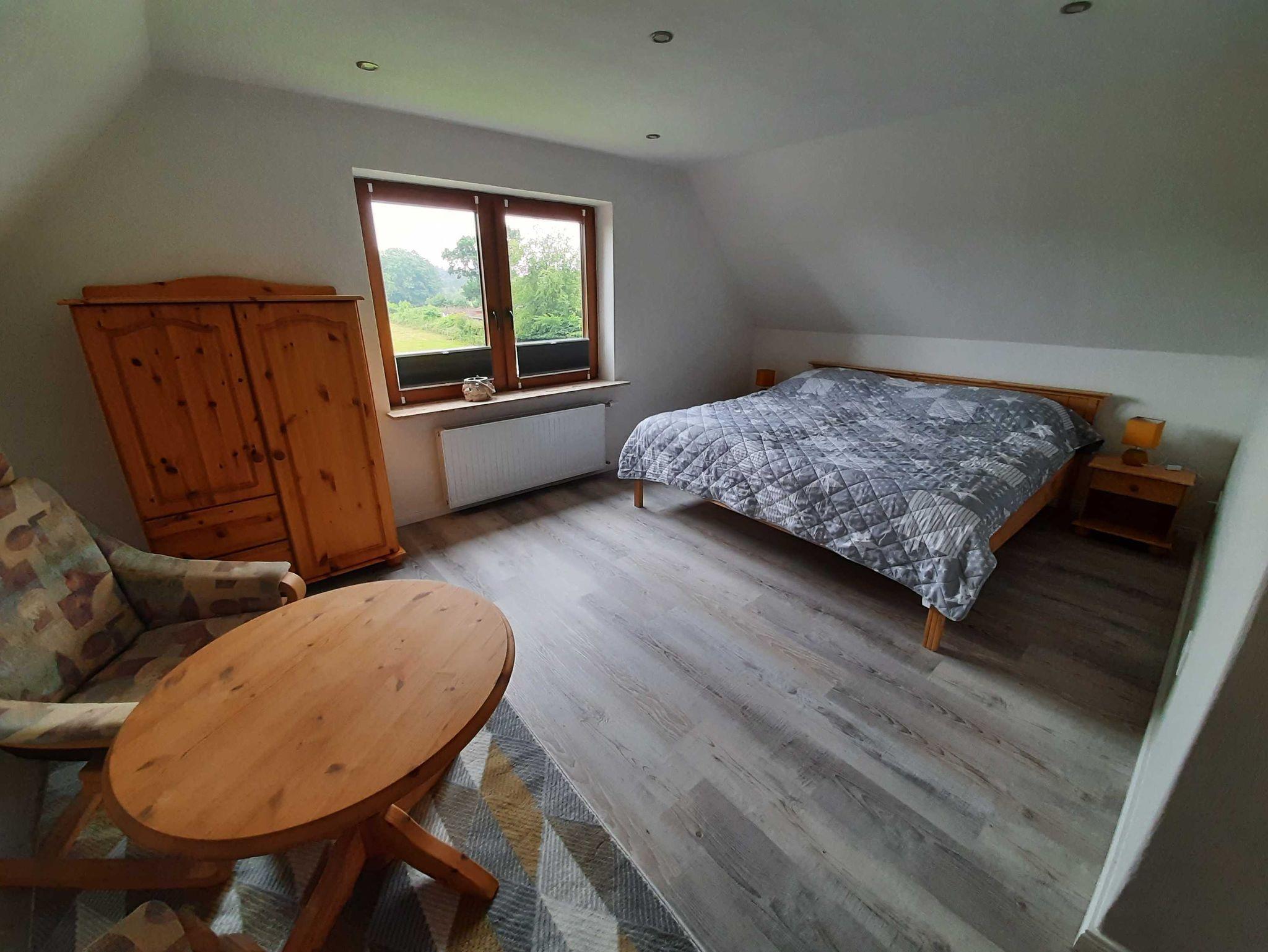 • Schlafzimmer mit Doppelbett (140 x 200); Fußbodenheizung; Bettwäsche zubuchbar; überdachte Terrasse anliegend