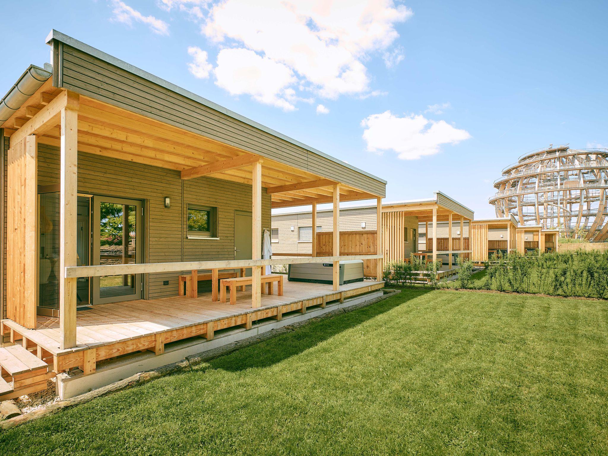 In unseren Relaxchalets haben vier Personen bequem Platz. Auf 55 qm Wohnfläche lasst Ihr es Euch gut gehen und entspannt im überdachten Wellnessbereich mit eigener Sauna, Ruheraum und privatem Whirlpool. Gebaut wurde dieses Chalet, wie alle unsere Kategorien, unter Nutzung nachhaltiger Baustoffe und in einer ressourcenschonenden Bauweise.