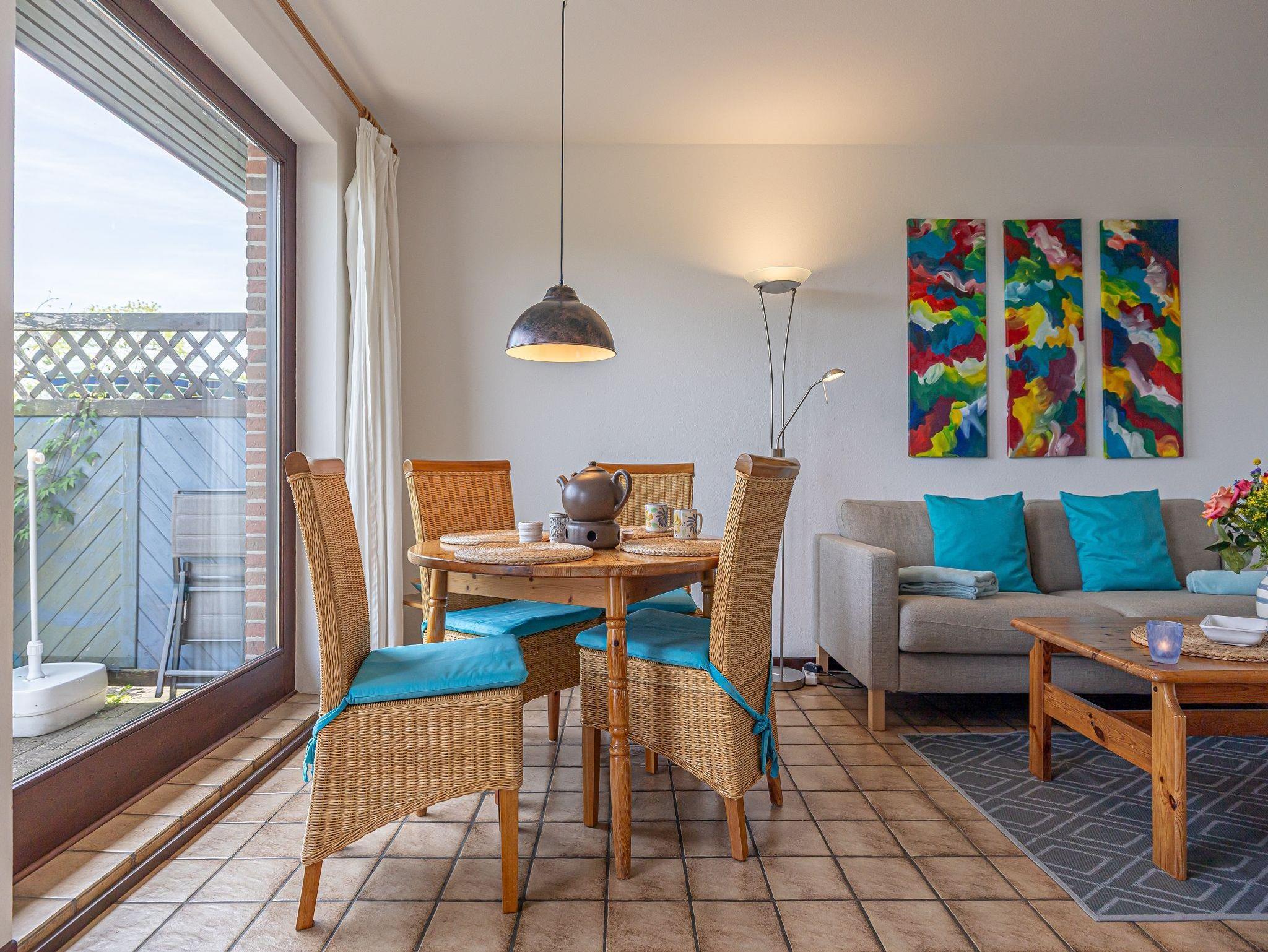 - Wohnbereich mit hellem Essbereich und direktem Zugang zur Terrasse mit Gartenmöbeln