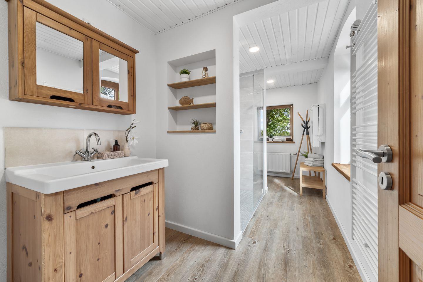Im Badezimmer des Erdgeschosses ist eine bodengleiche Dusche, ein Waschbecken, ein Spiegel und ein WC vorhanden.