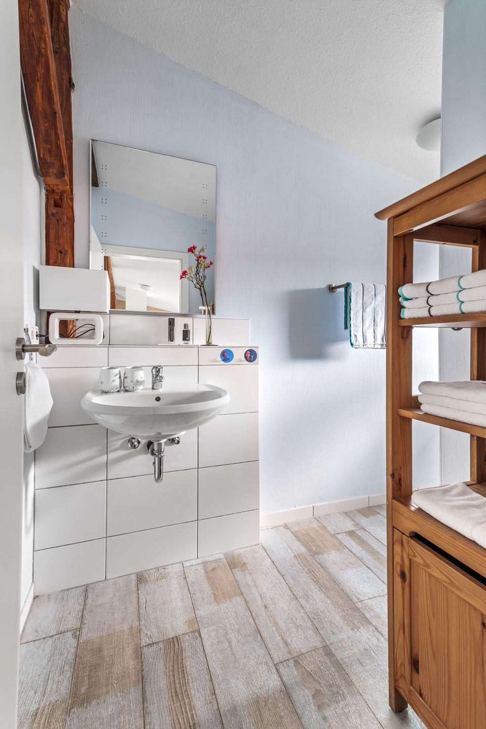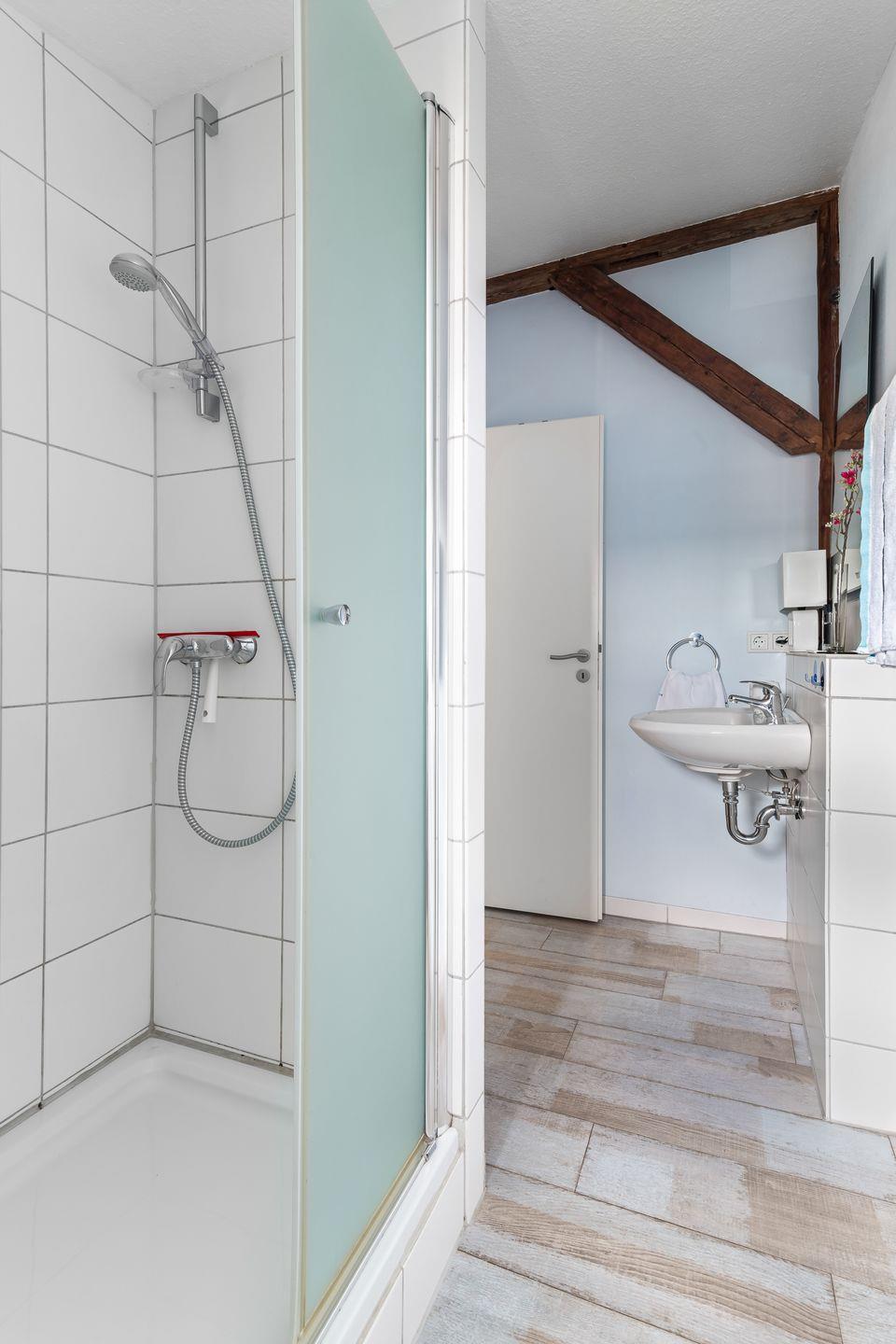 Das Badezimmer im Obergeschoss ist mit einer Dusche, einem Waschbecken, einem Spiegel und einem WC ausgestattet.