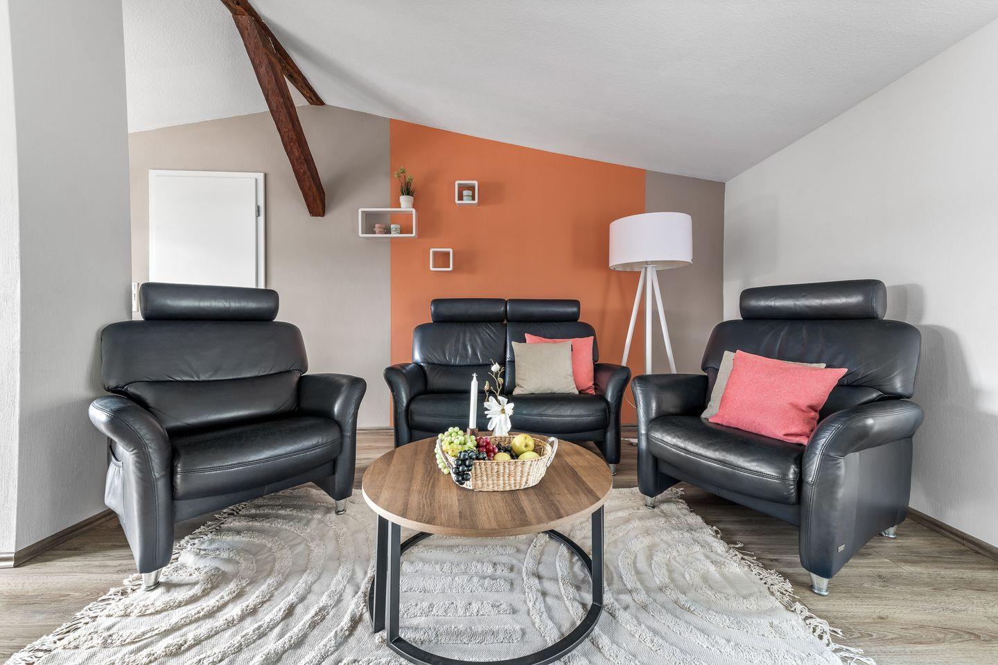 Ihnen stehen 2 komfortable Schlafzimmer zur Verfügung, davon eines mit Doppelbett und eines mit zwei Einzelbetten. Im lichten Wohn-Essbereich eröffnet sich der Blick hinaus auf die schöne Landschaft.